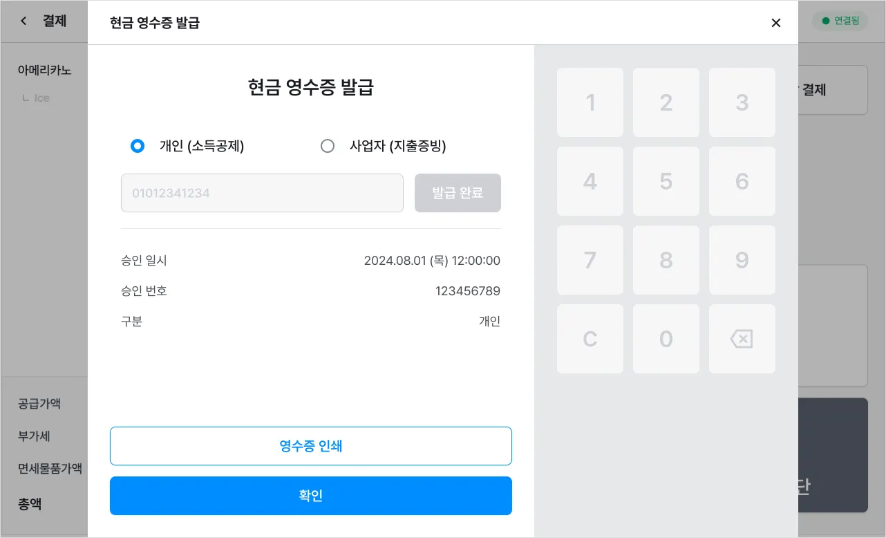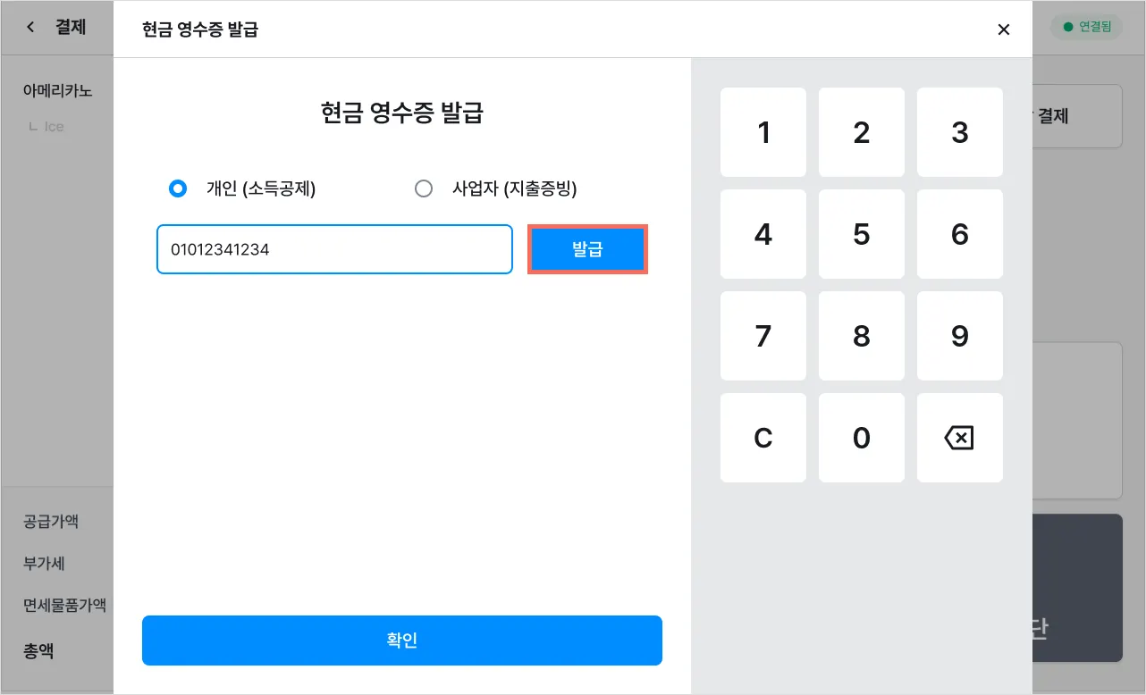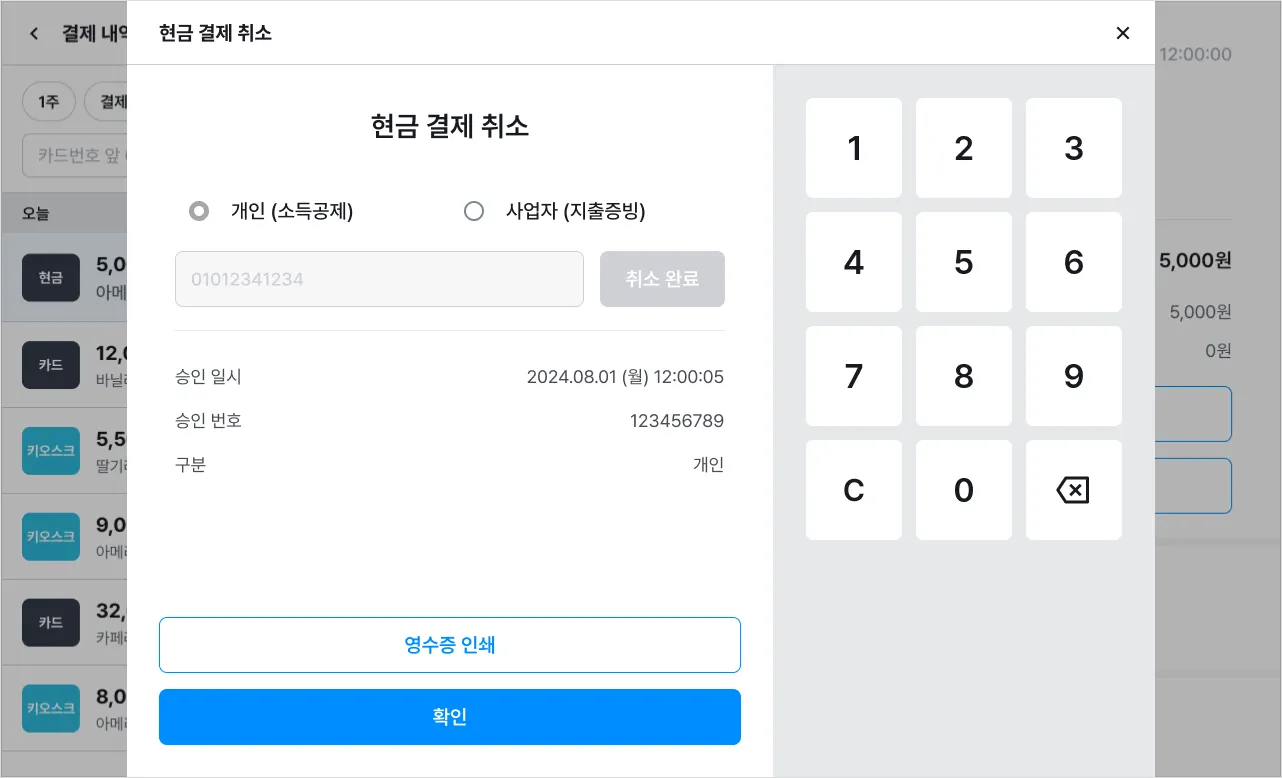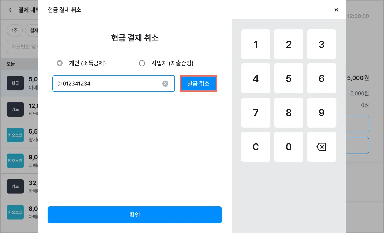 현금 영수증 발급 건을 환불하려면 발급 당시 입력했던 번호를 동일하게 입력해야 합니다.