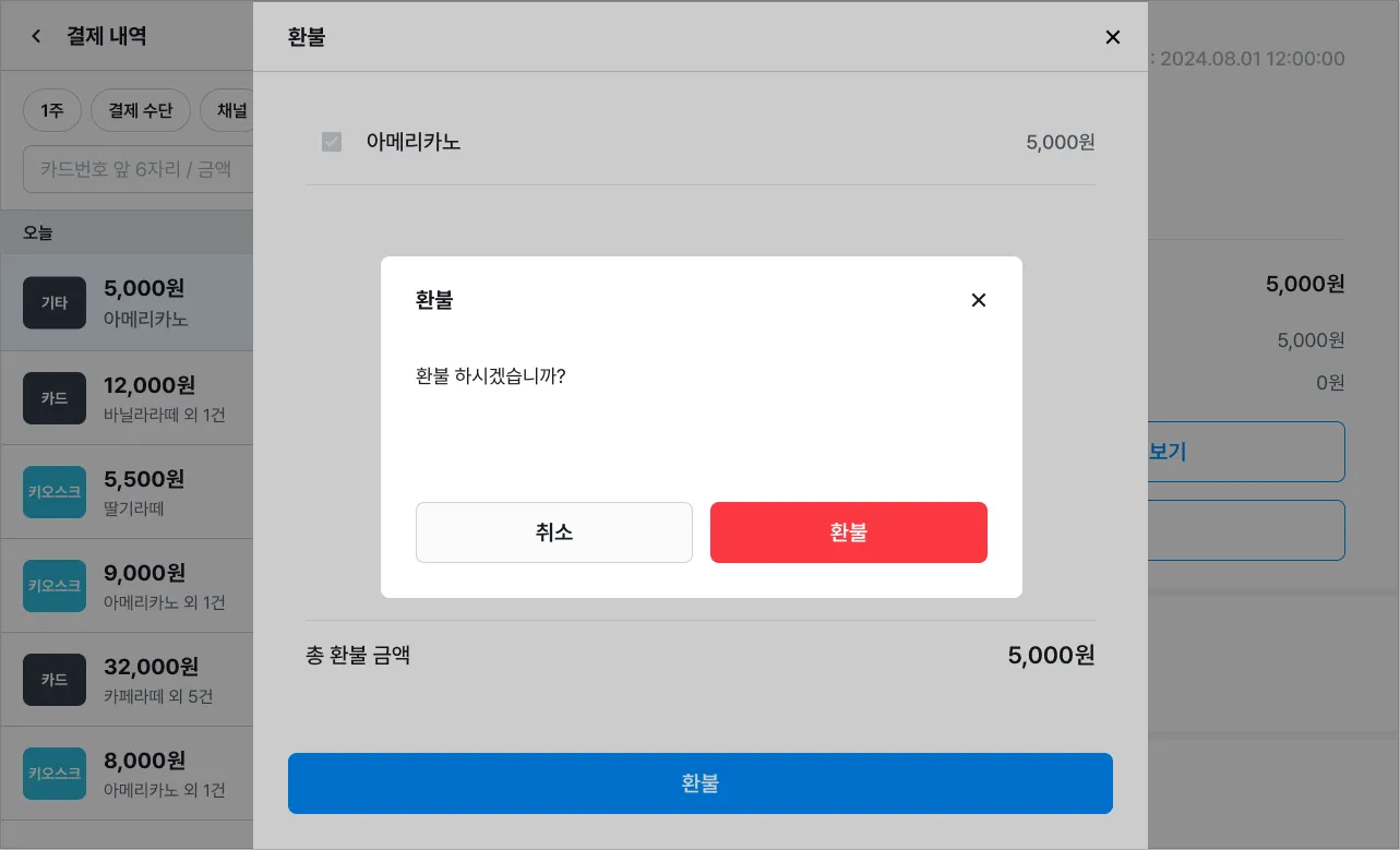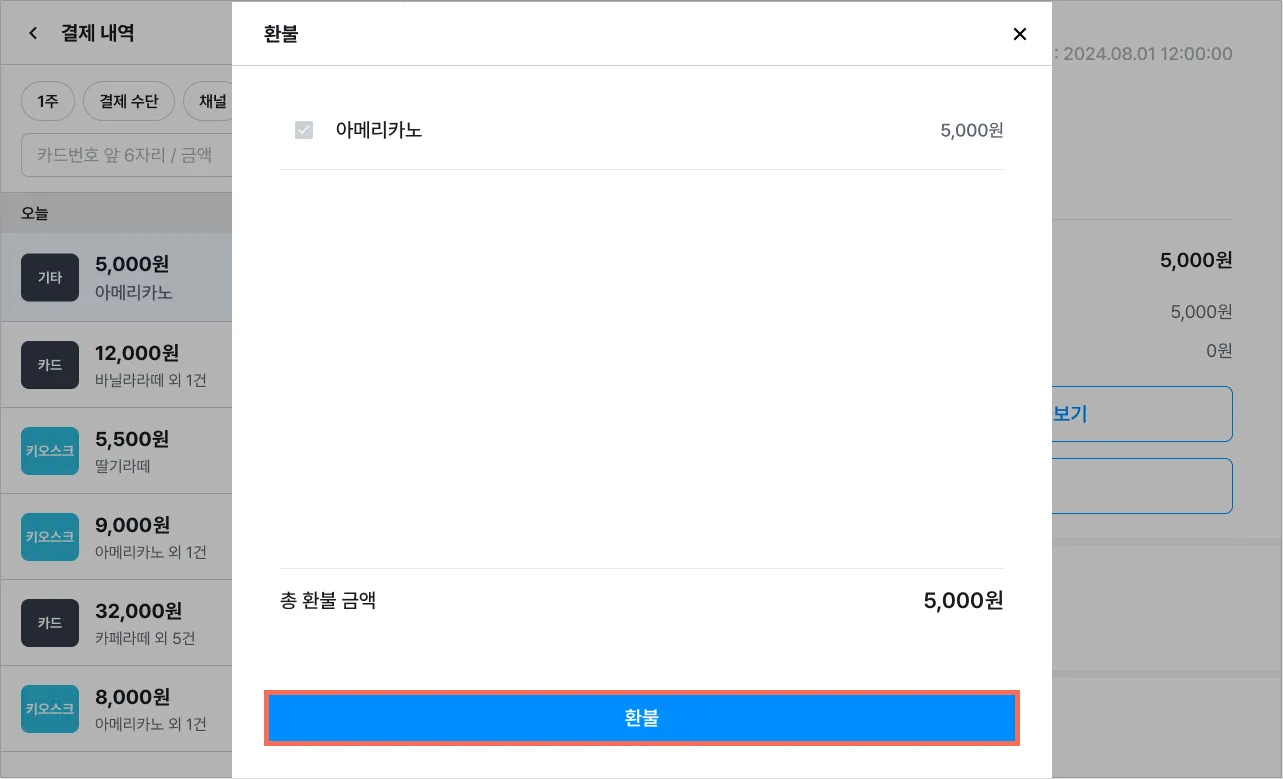 3) 내역을 확인한 후 [환불] → [환불]을 눌러주세요.