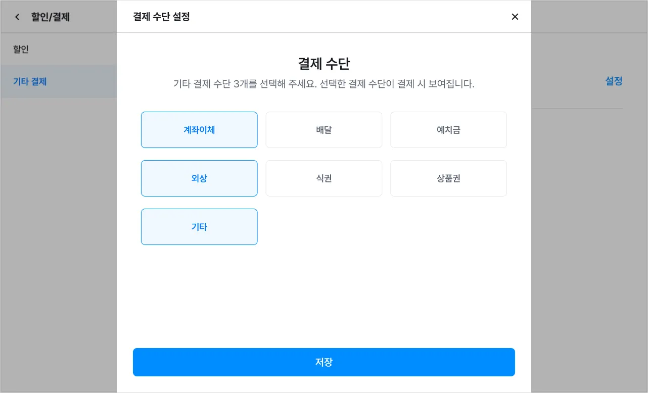 4) 원하는 결제 수단 3개를 선택하고 [저장]을 눌러주세요.