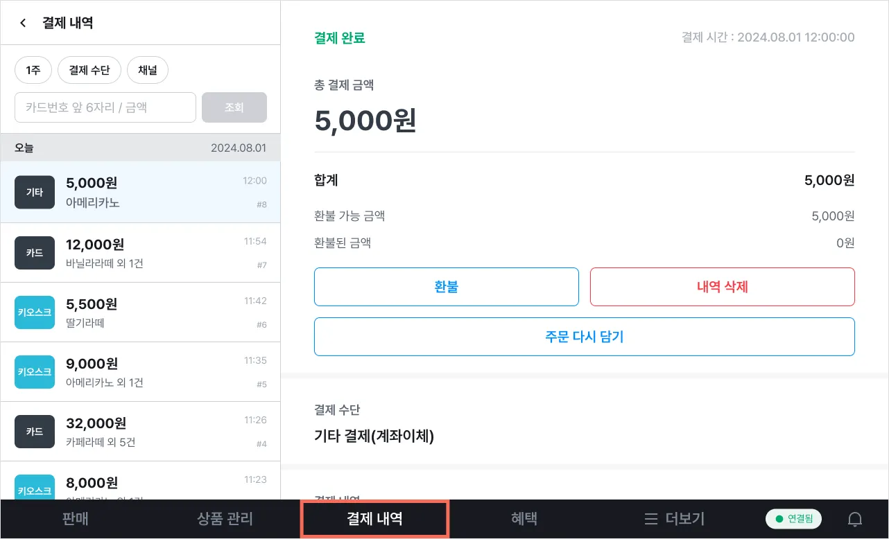 도소매 유형은 화면 하단에서 [결제 내역] 탭으로 확인할 수 있어요.