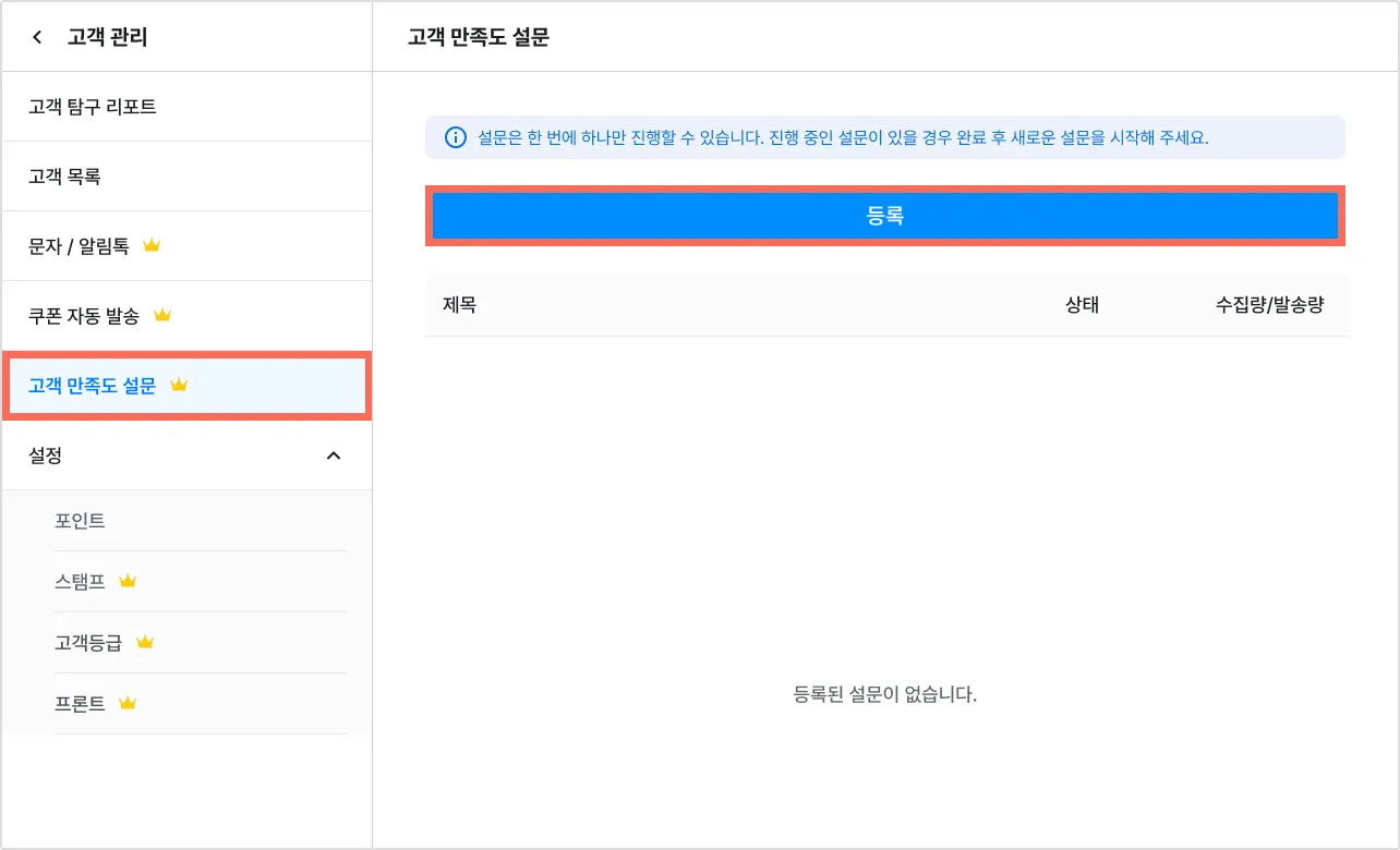 2) [고객 만족도 설문] → [등록]을 눌러주세요.