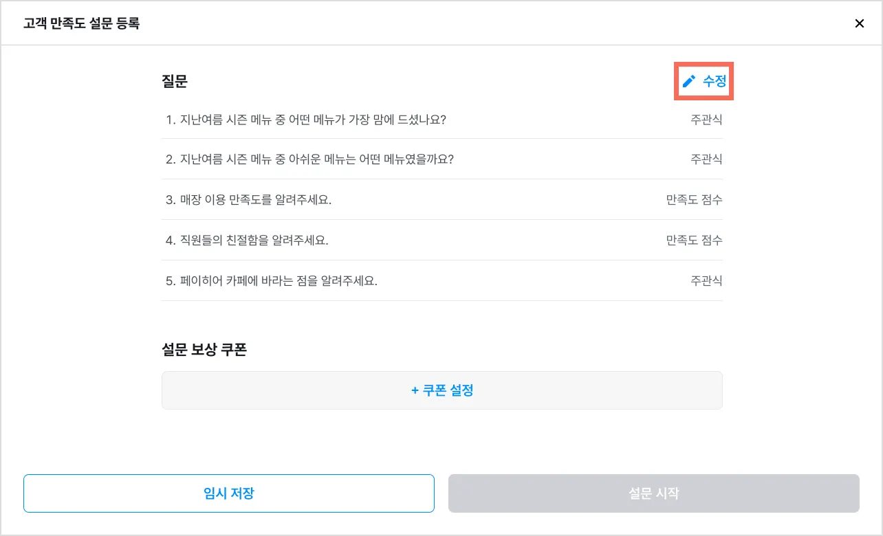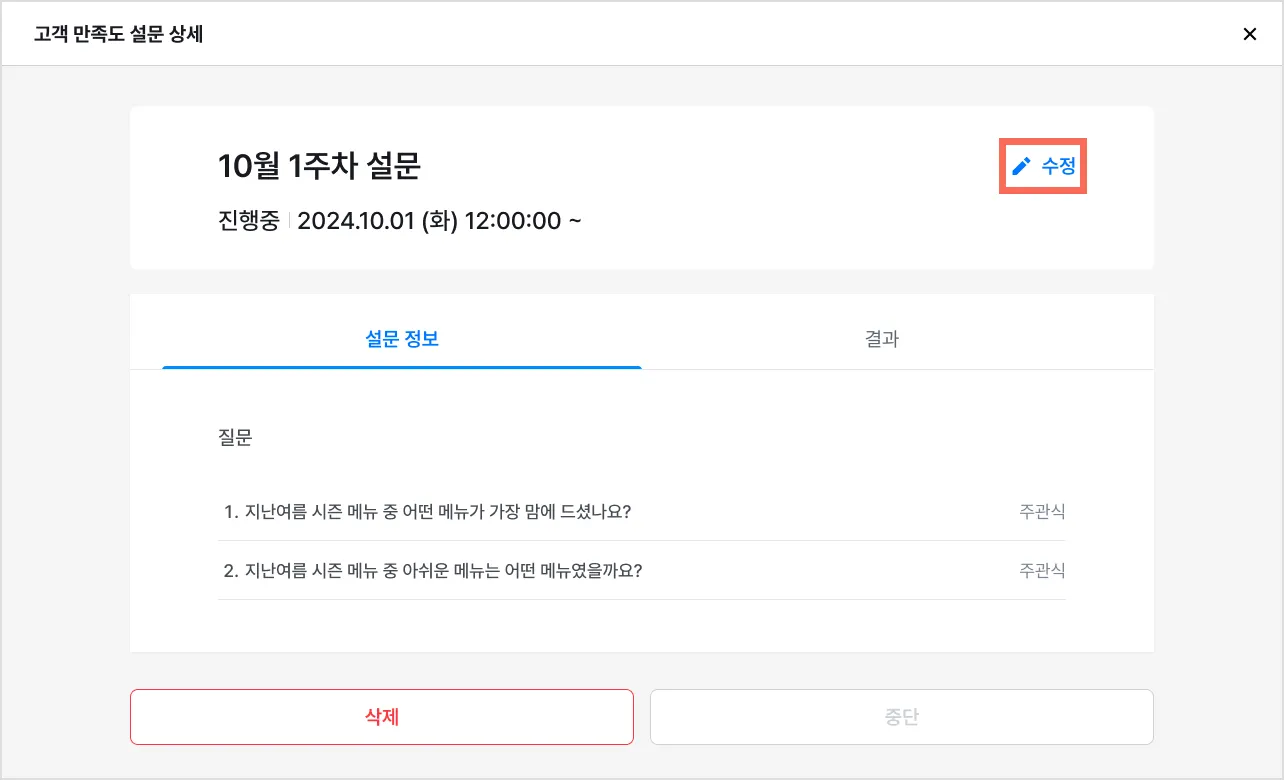 : 수정]을 누르면 설문 등록으로 이동해요.