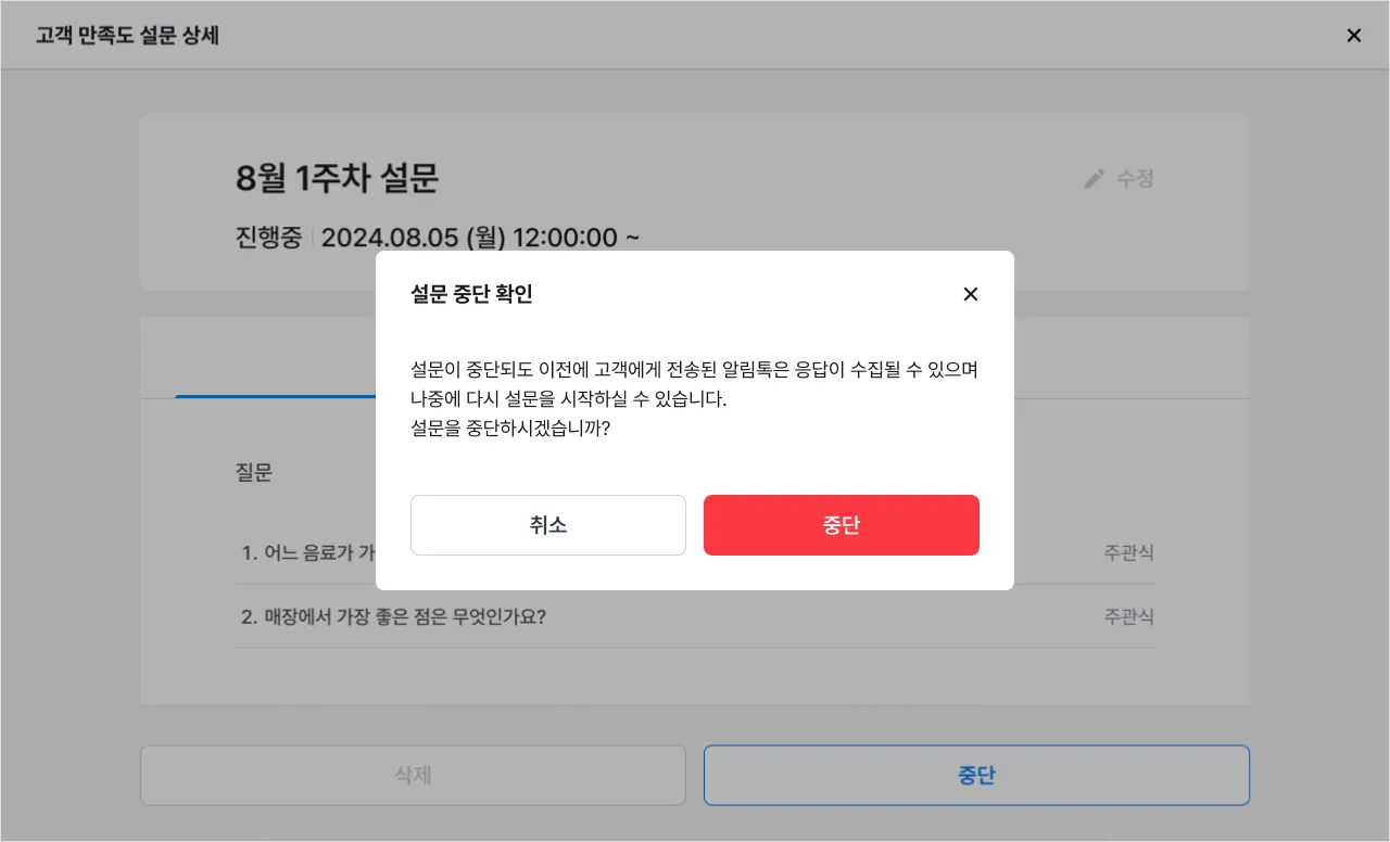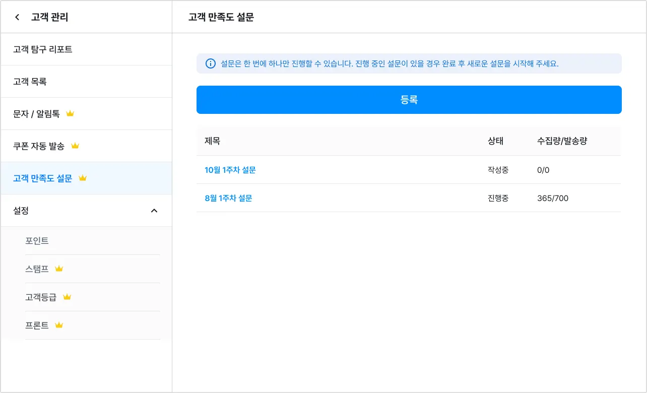 진행 중인 설문이 있을 경우 다른 설문 조사를 추가 등록할 수 없어요.