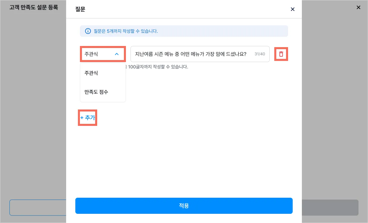 1개의 설문 조사 당 질문은 최대 5개까지 추가가 가능해요.