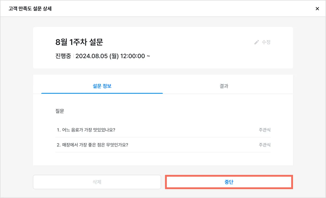 ② 중단할 설문 제목을 눌러주세요.