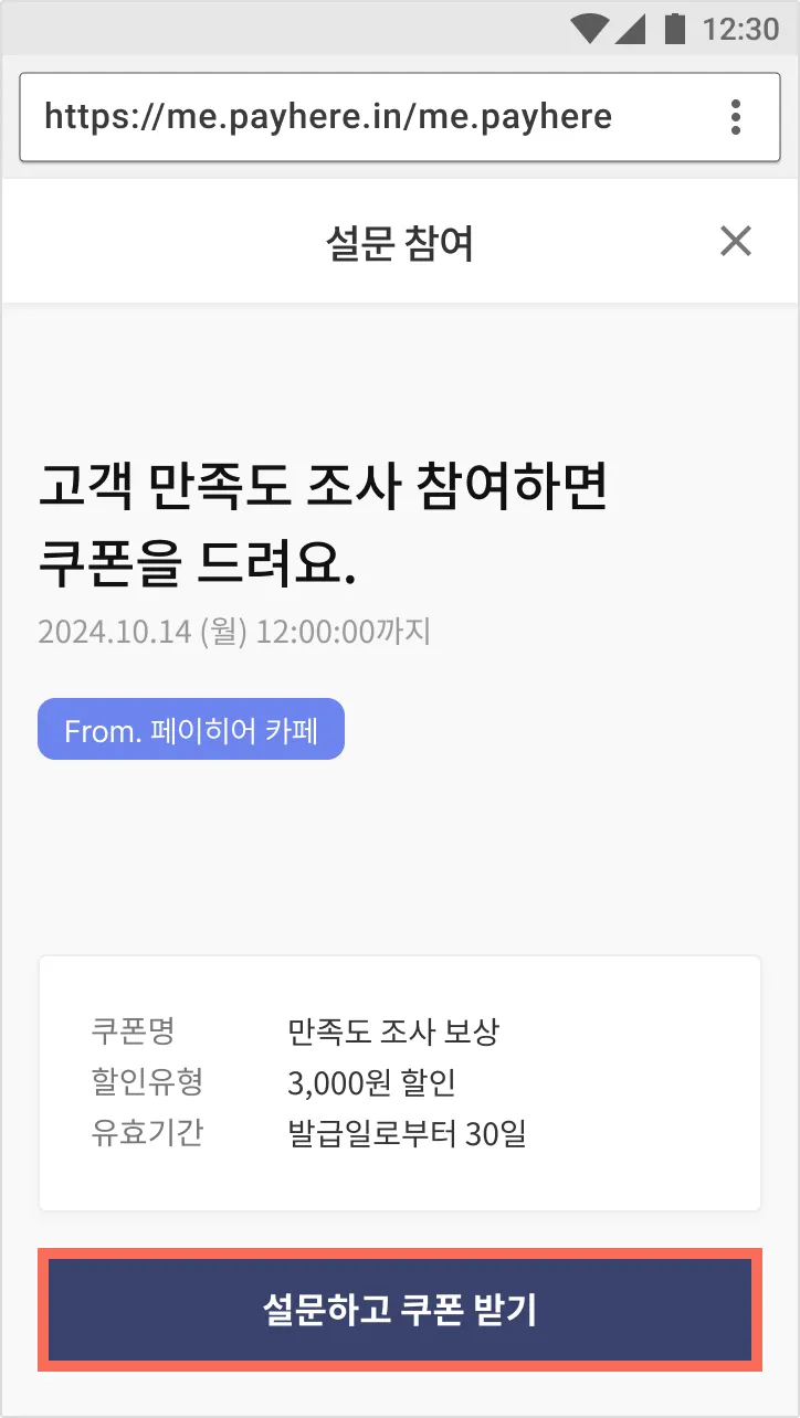 2) [설문하고 쿠폰 받기]를 눌러주세요.
