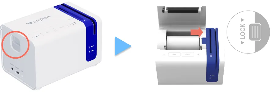 2) LOCK 버튼을 오른쪽으로 밀면 단말기와 프린터가 결합된 상태로 고정돼요.