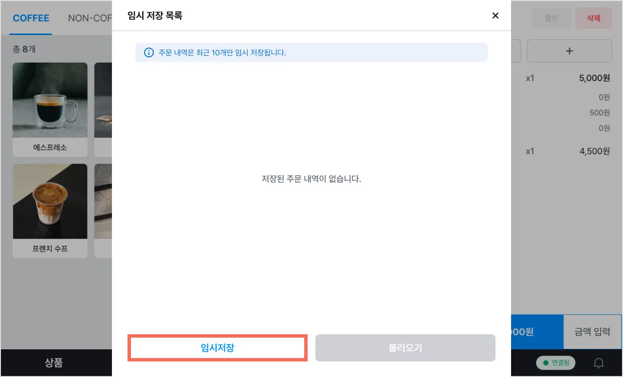 주문 목록은 최대 10개까지 임시 저장이 가능해요.