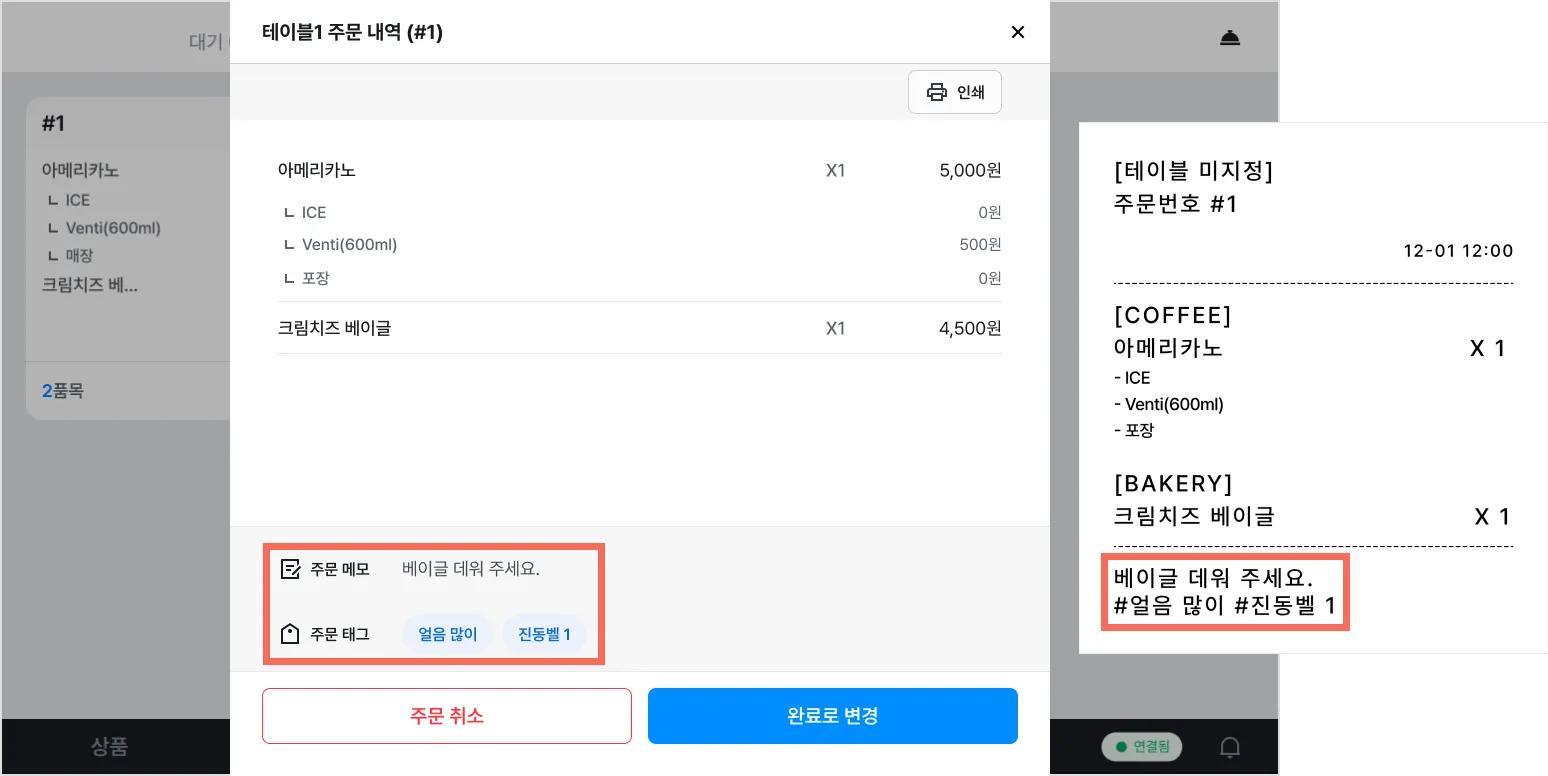 3) 적용된 메모는 결제 완료 후 [주문 내역] 탭 또는 출력된 주문서를 통해 확인이 가능해요.