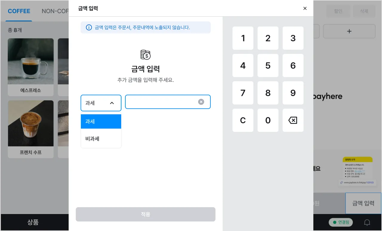 2) 과세 · 비과세 여부를 선택한 다음, 금액을 입력하고 [적용]해 주세요.