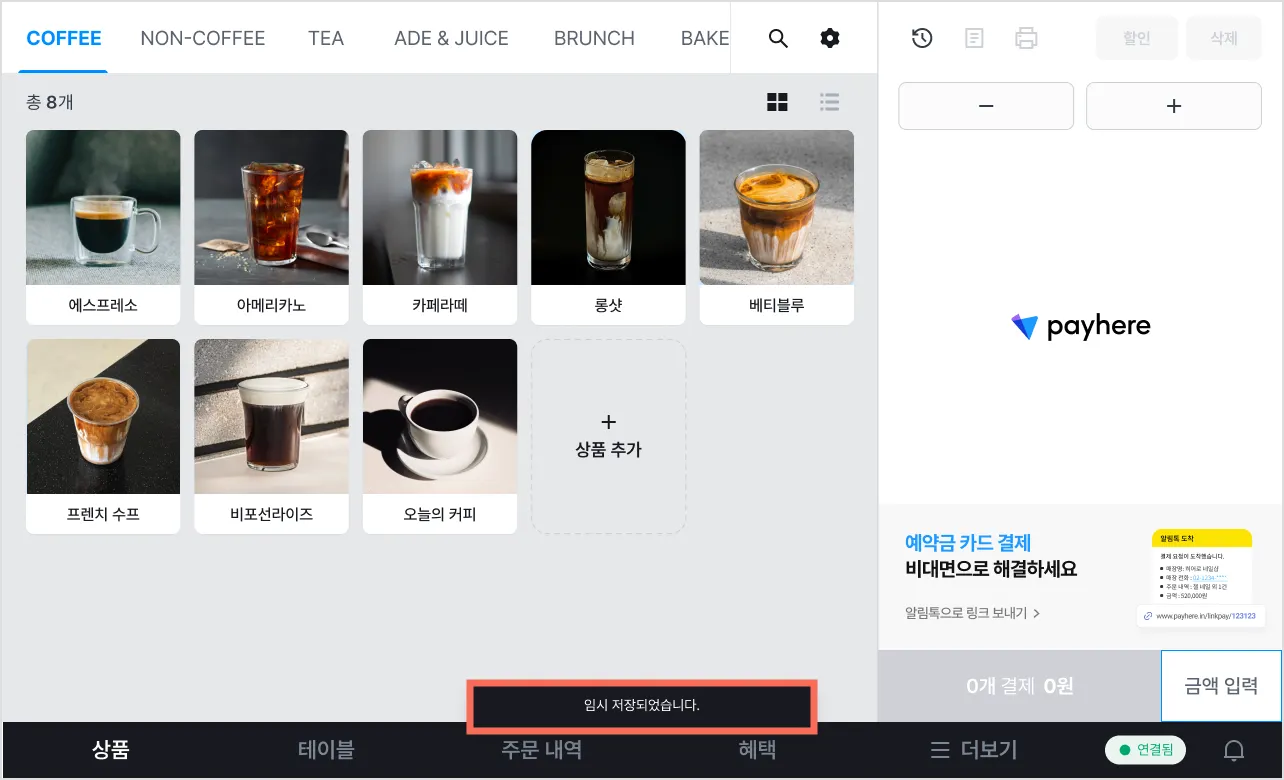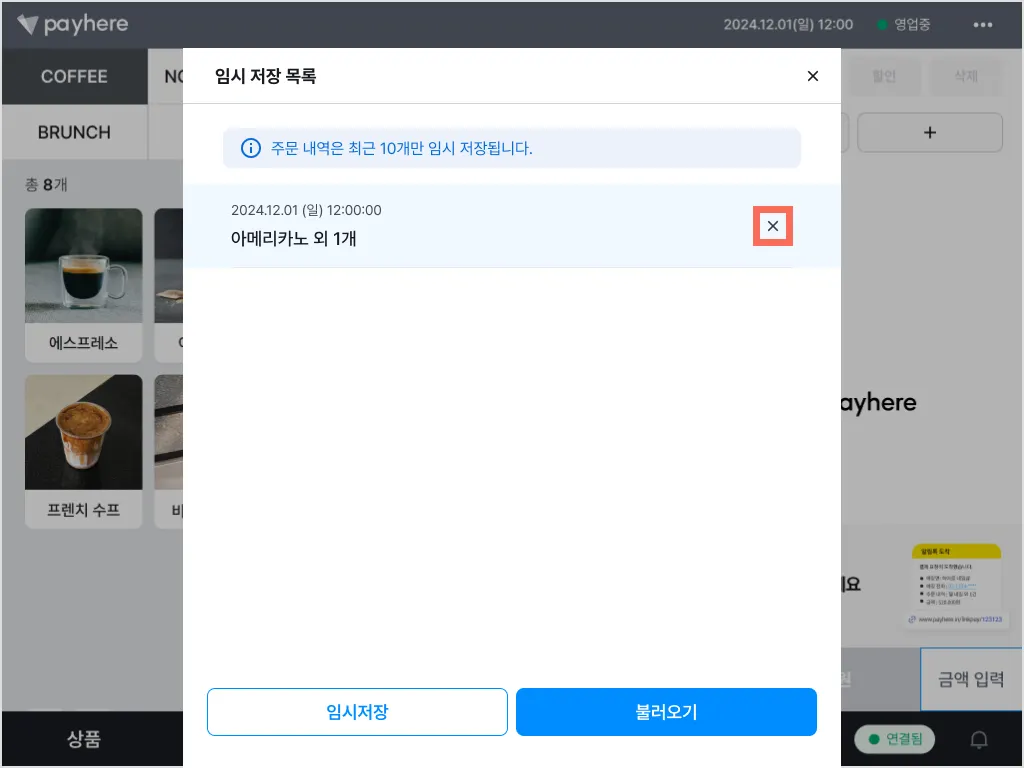 6) 임시 저장된 주문 목록이 불러와 진 것을 확인할 수 있어요.