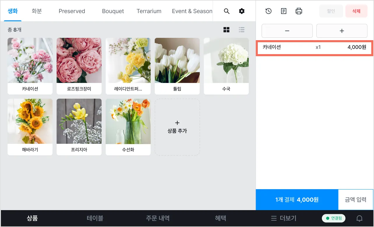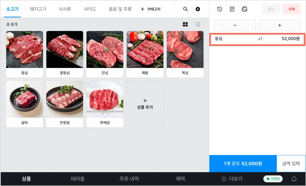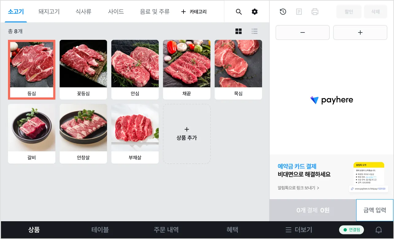 상품 또는 결제 금액을 담으면 오른쪽 주문 목록에 표시돼요.