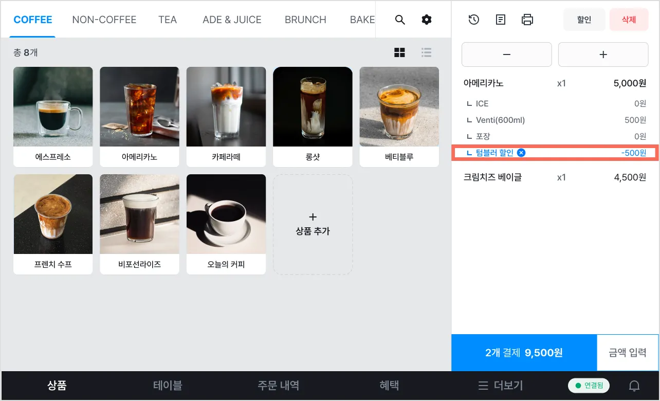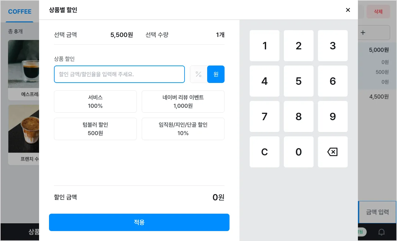 2) 할인율 또는 금액을 직접 입력하거나 자주 사용하는 할인은 퀵 버튼으로 만들어 적용할 수 있어요.