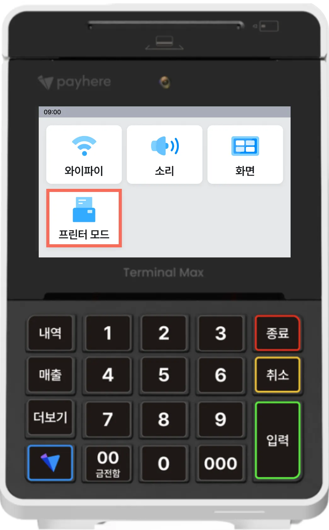 2) 터미널 맥스에서 [더보기] 키를 누른 다음, [프린터 모드]를 눌러주세요.