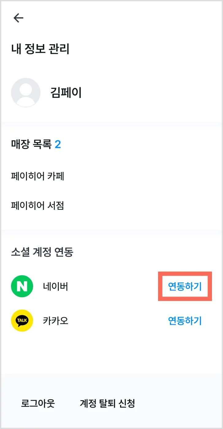 페이히어 앱 : [나의 매장] → [플레이스 연동]