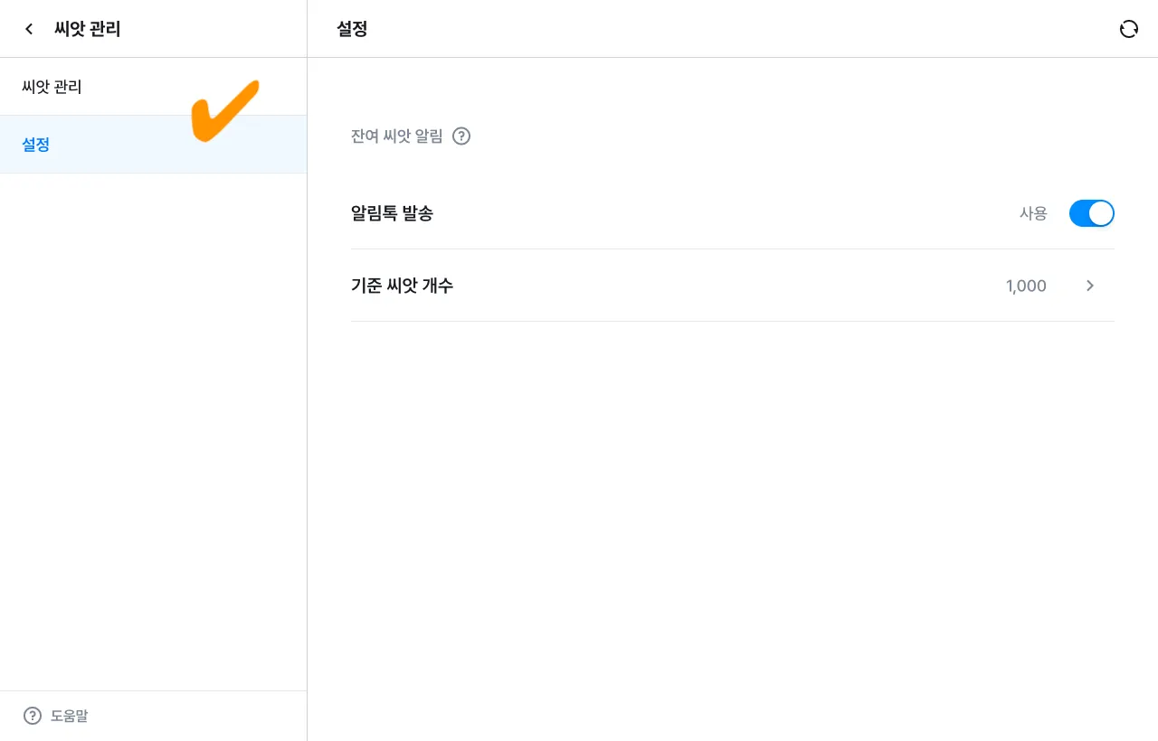 2) [설정] 메뉴에서 잔여 씨앗 알림 발송 여부를 설정할 수 있습니다.