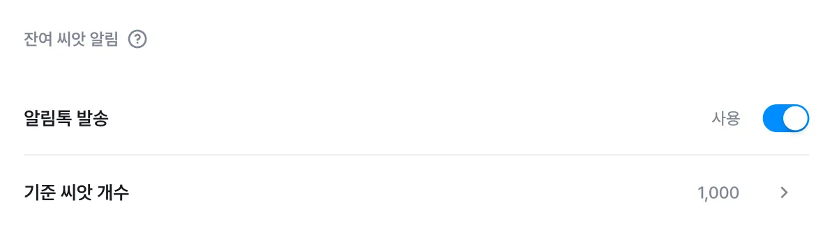잔여 씨앗 안내를 알림톡으로 받도록 설정할 수 있어요.