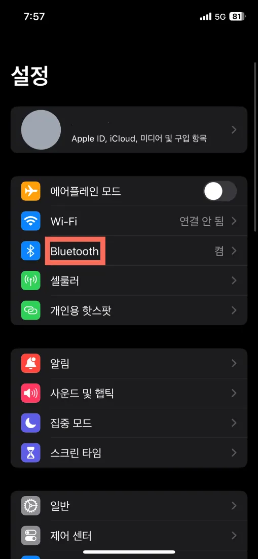 1) 태블릿 또는 휴대폰 [설정]에서 [Bluetooth]를 눌러주세요.