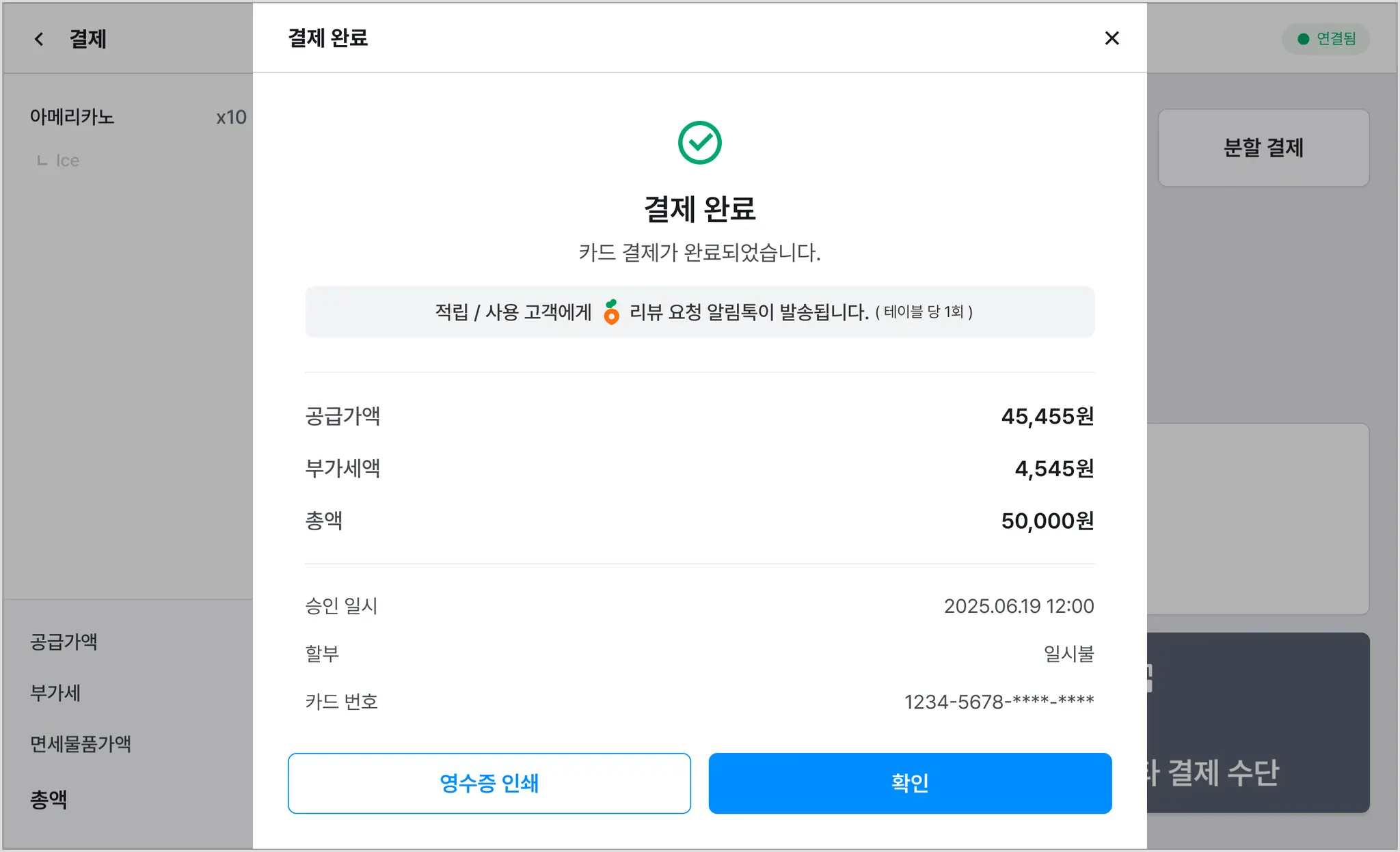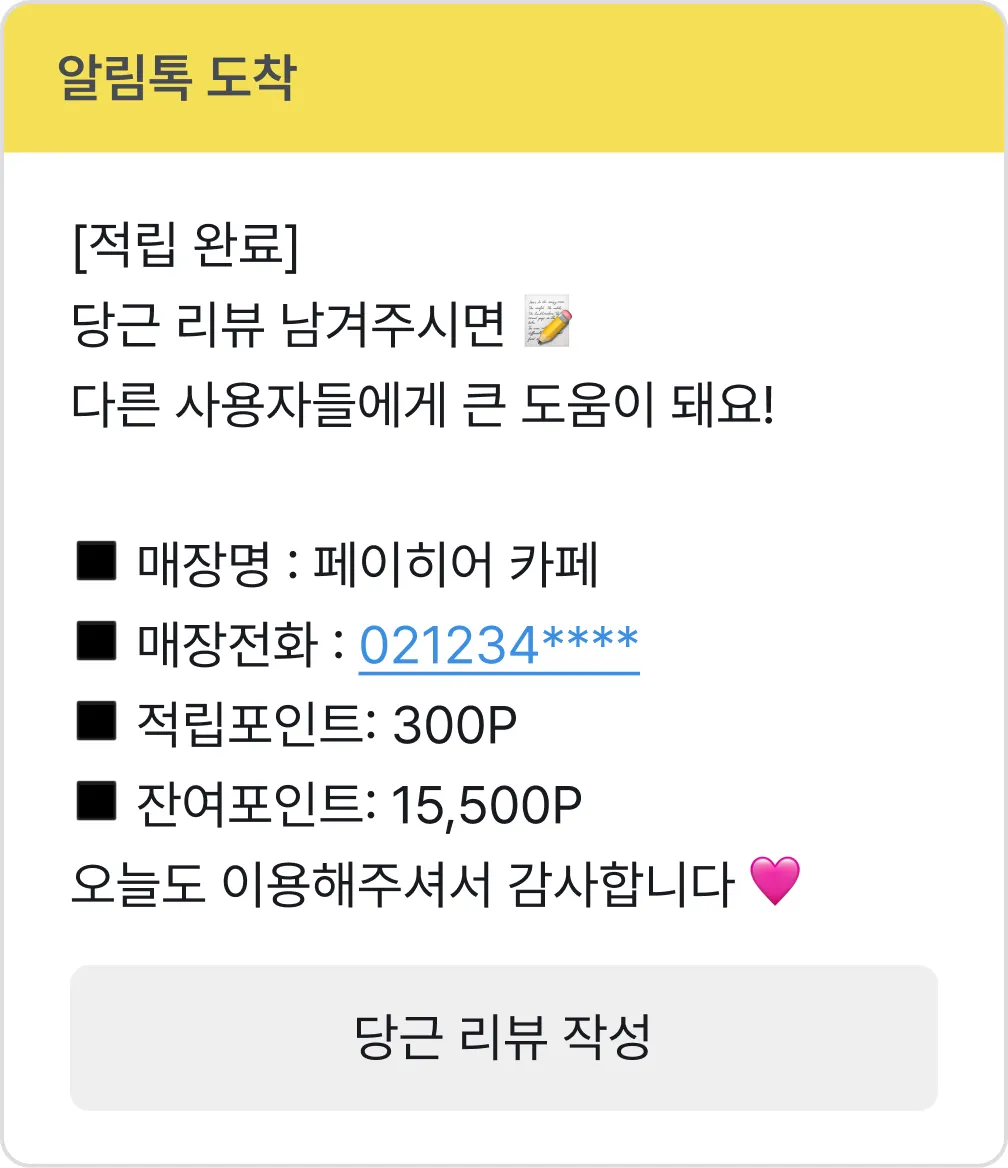 결제 중 고객 번호만 입력하면, 리뷰 요청 알림톡이 자동 발송돼요.