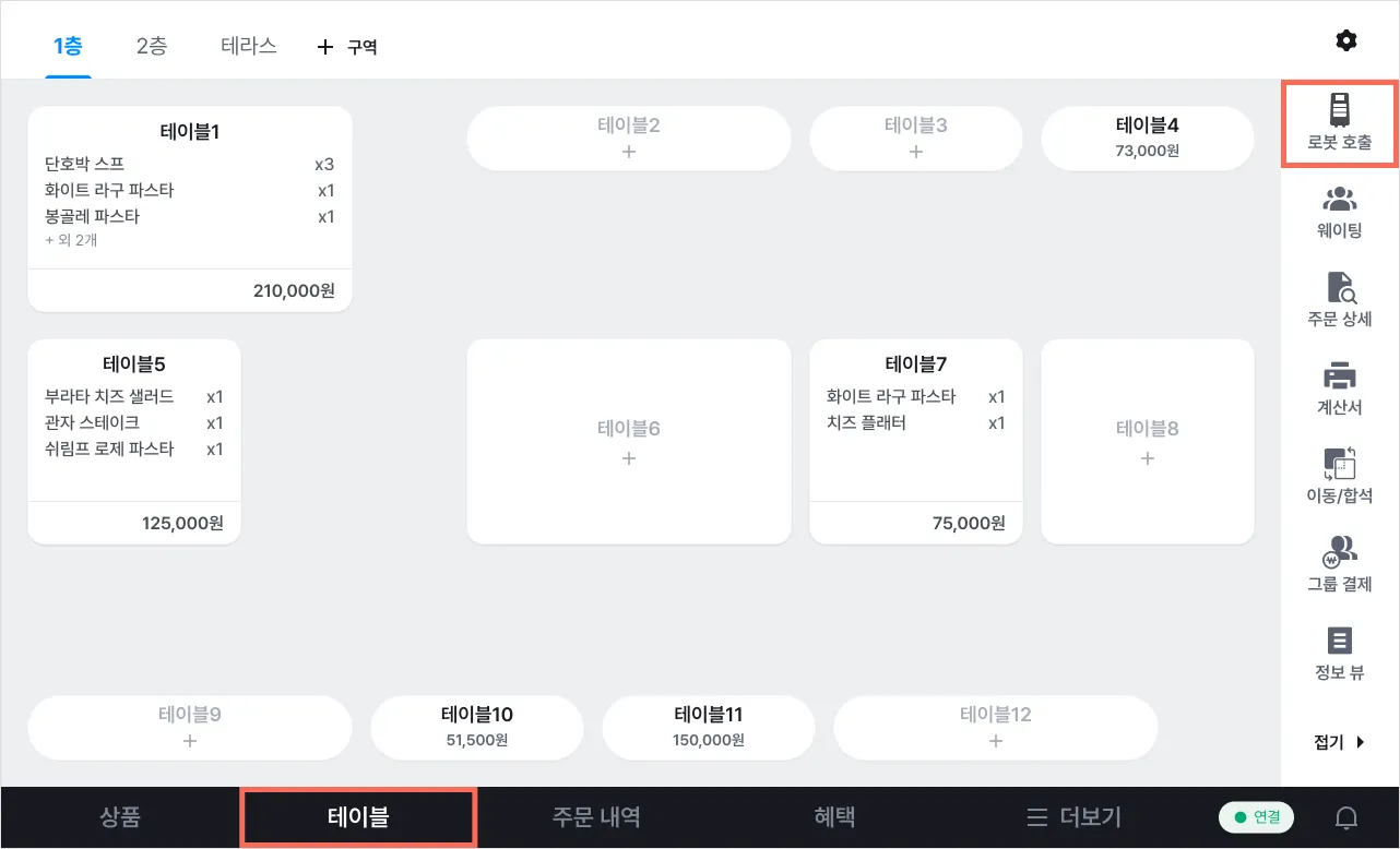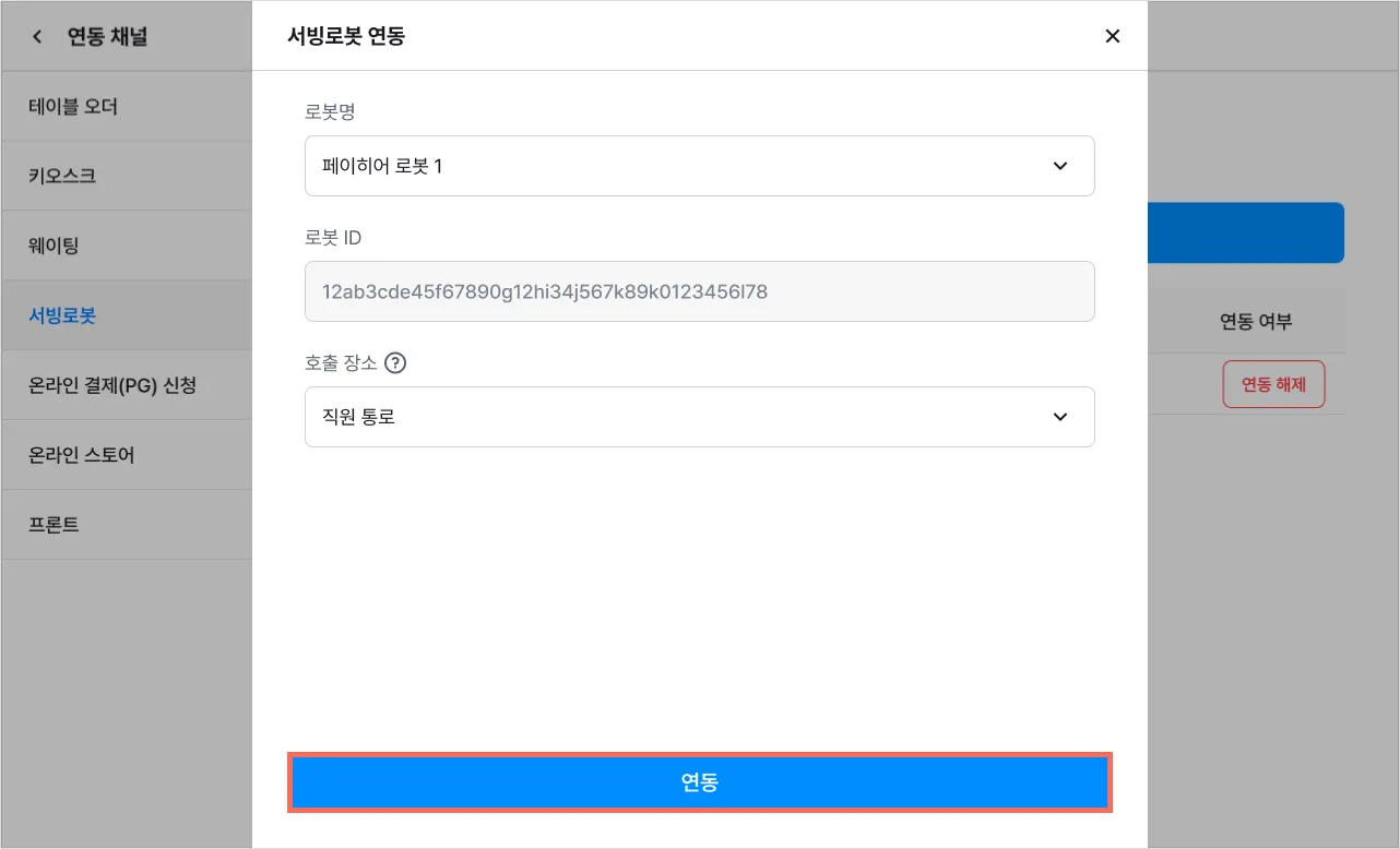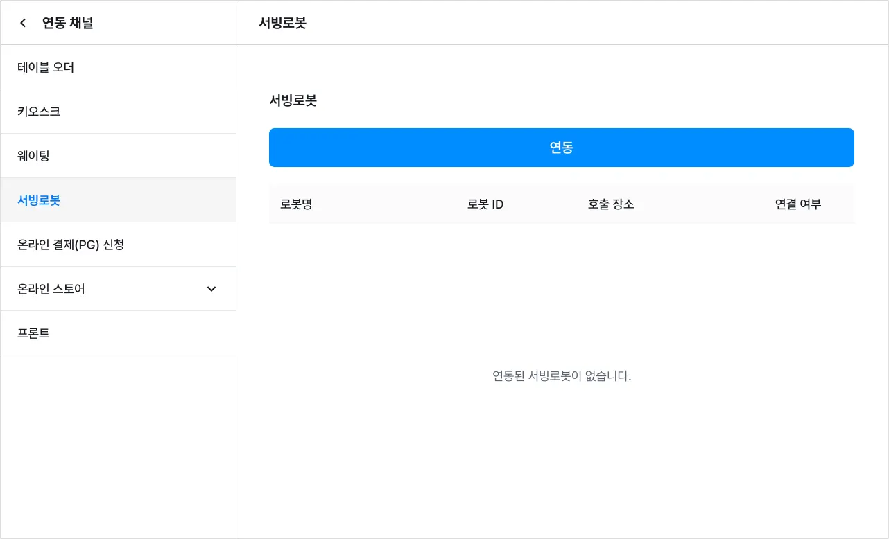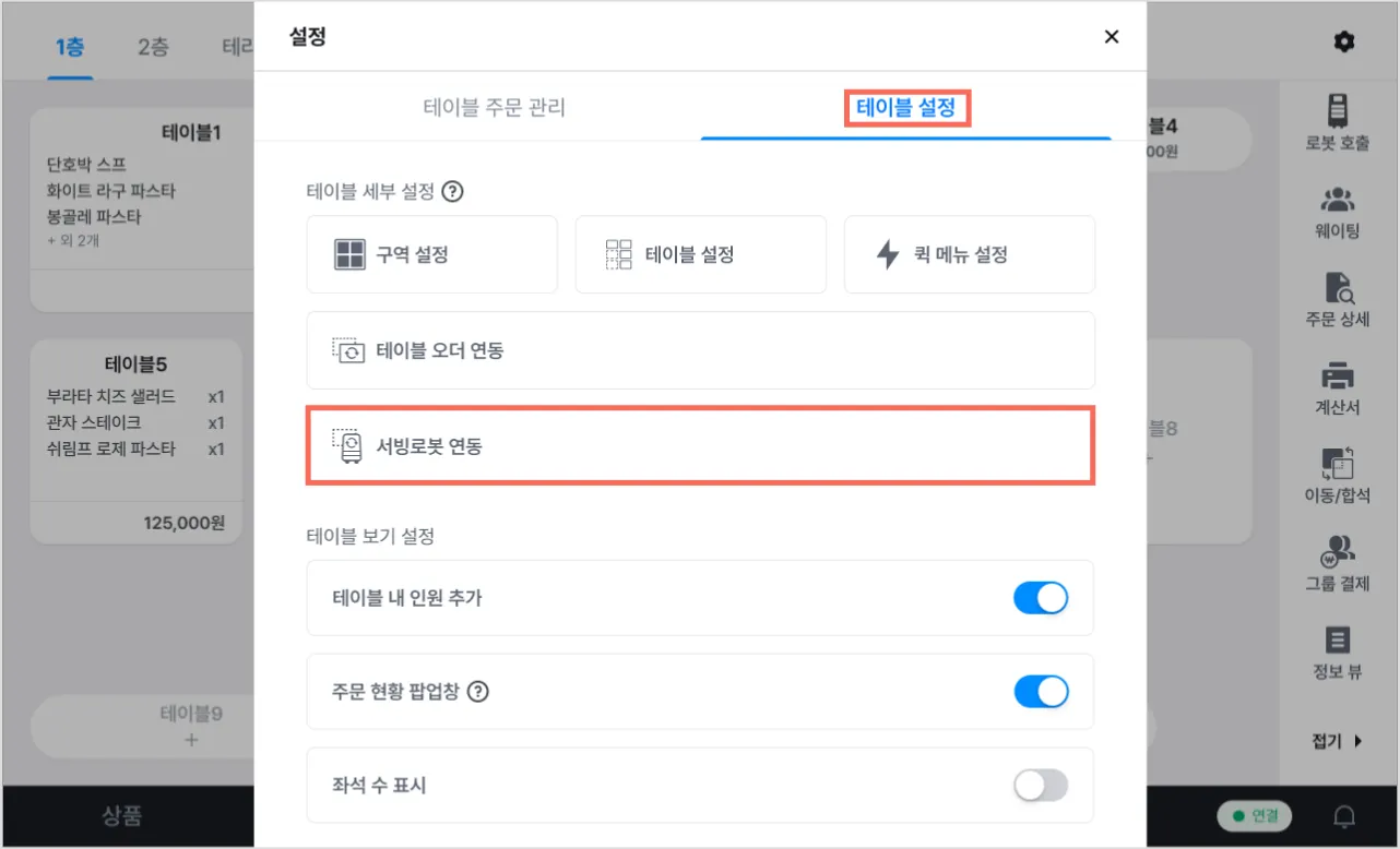 2) [테이블 설정] → [서빙 로봇 연동]을 눌러주세요.