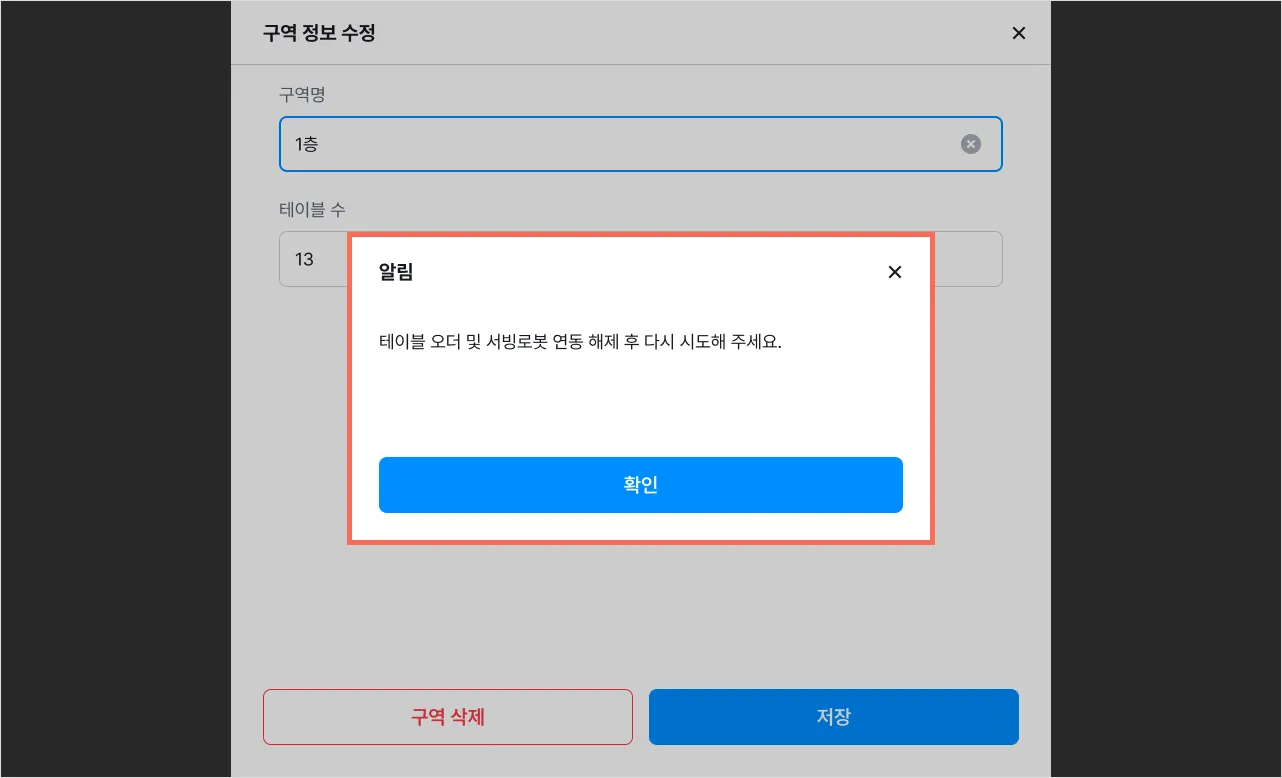 서빙 로봇이 연동된 테이블 삭제 시 안내창