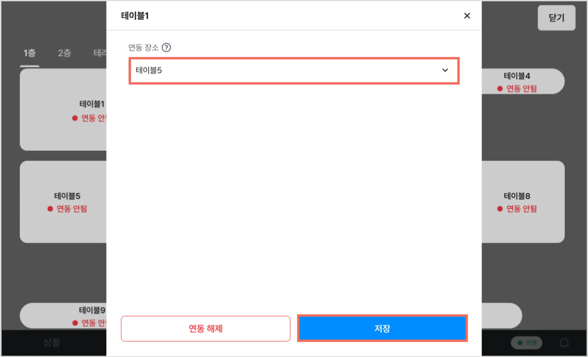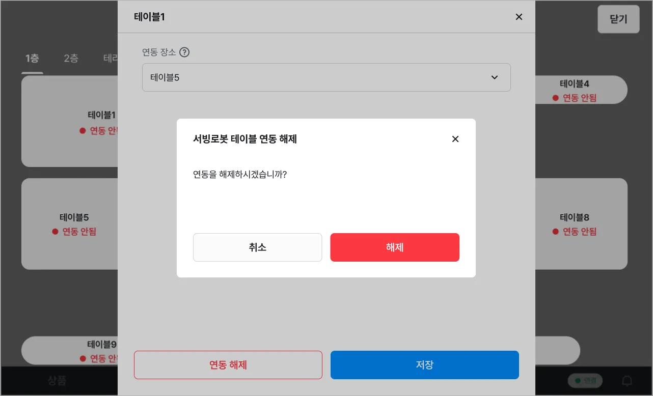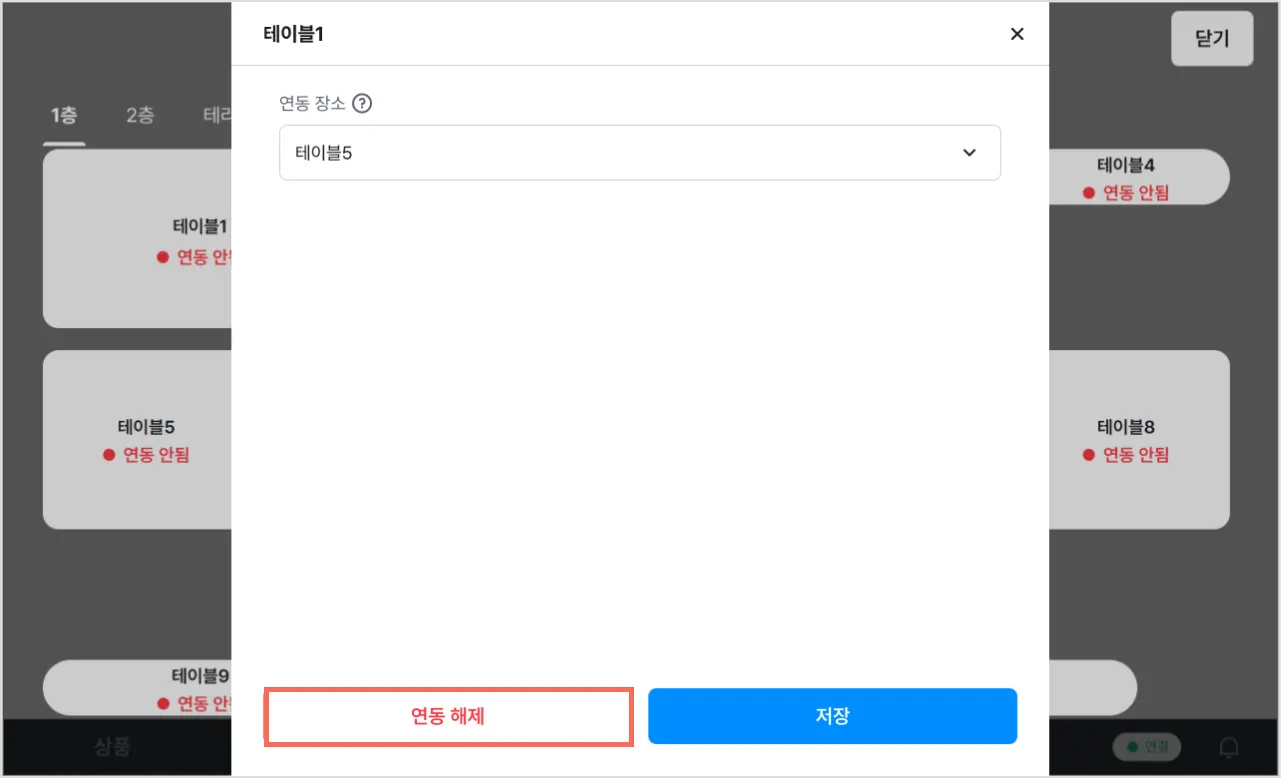 [연동 해제] → [해제]를 누르면 해당 테이블에 연동된 장소가 삭제됩니다.