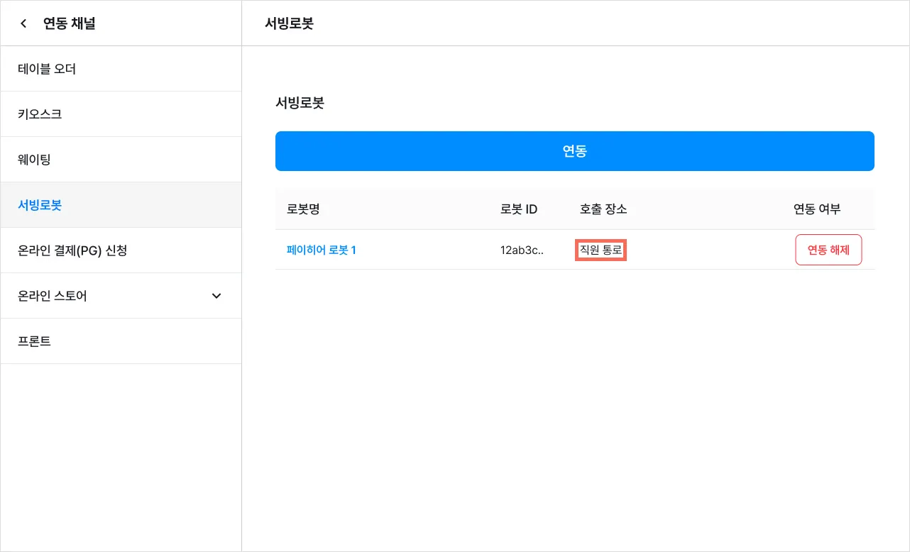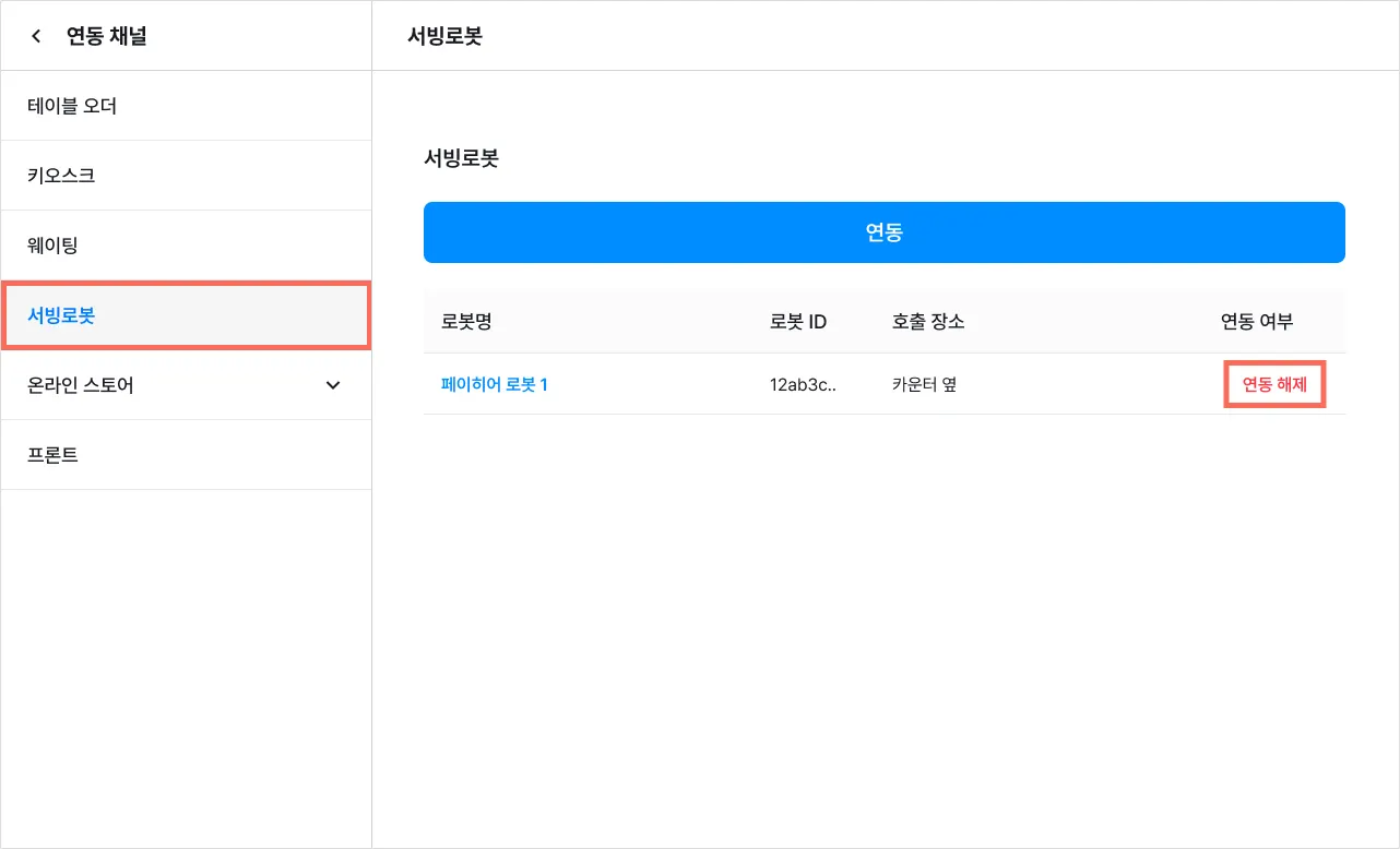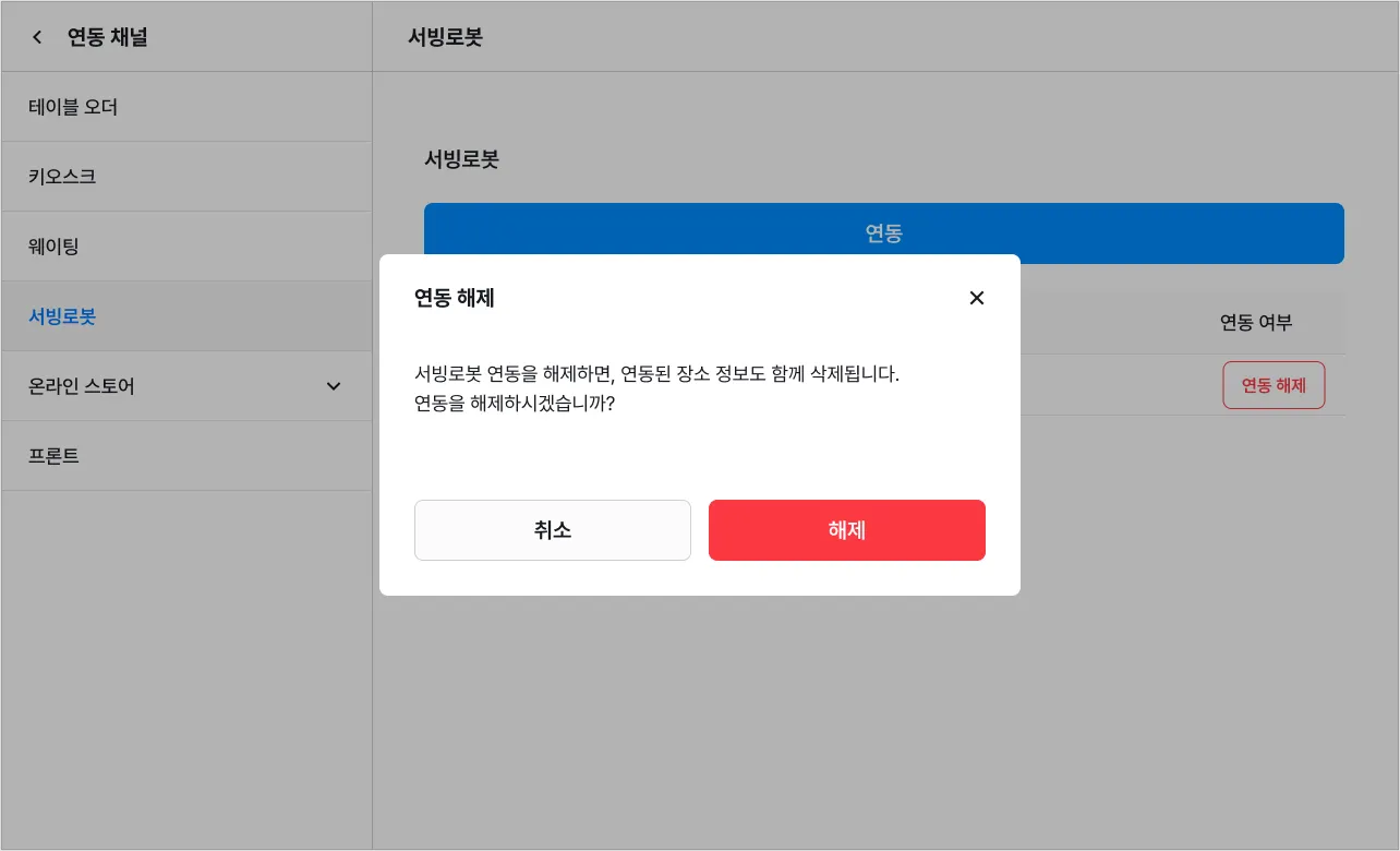 연동 해제 시 셀러에 저장된 로봇 관련 정보(호출 장소 및 연동 장소)가 모두 삭제됩니다.