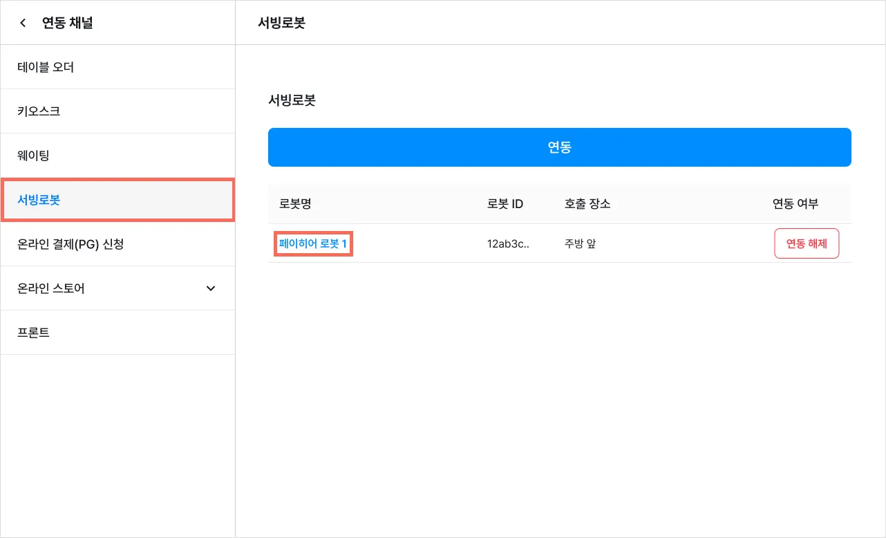1) 로봇명 오른쪽에 있는 [연동 해제]를 눌러주세요.