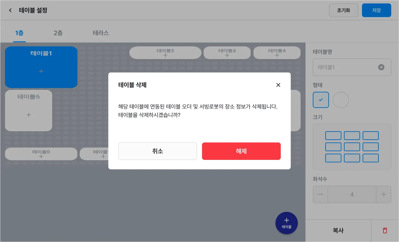 [테이블] 탭에서 테이블 삭제시 해당 테이블에 연동된 서빙 로봇 정보도 삭제됩니다.