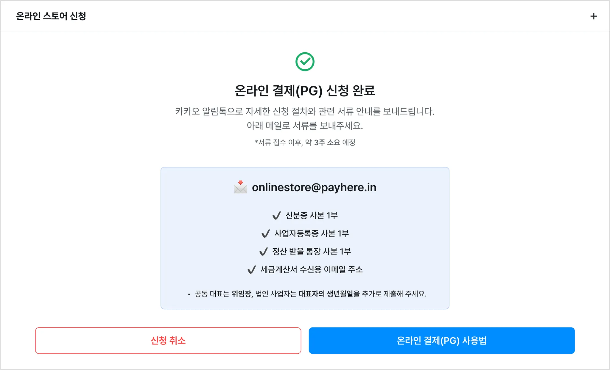 메일로 후속 절차를 안내해 드리니, 메일(onlinestore@payhere.in) 로 도착하는 메일을 꼭 확인해주세요.