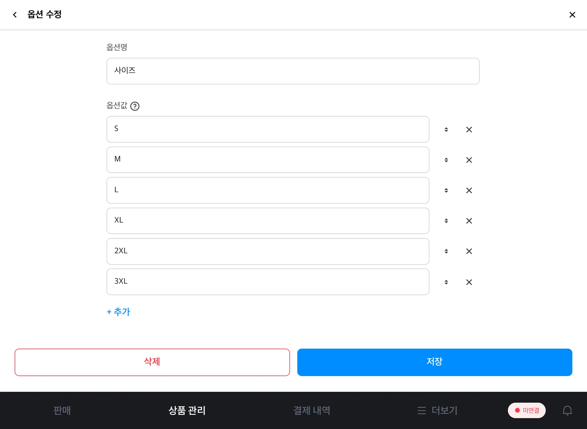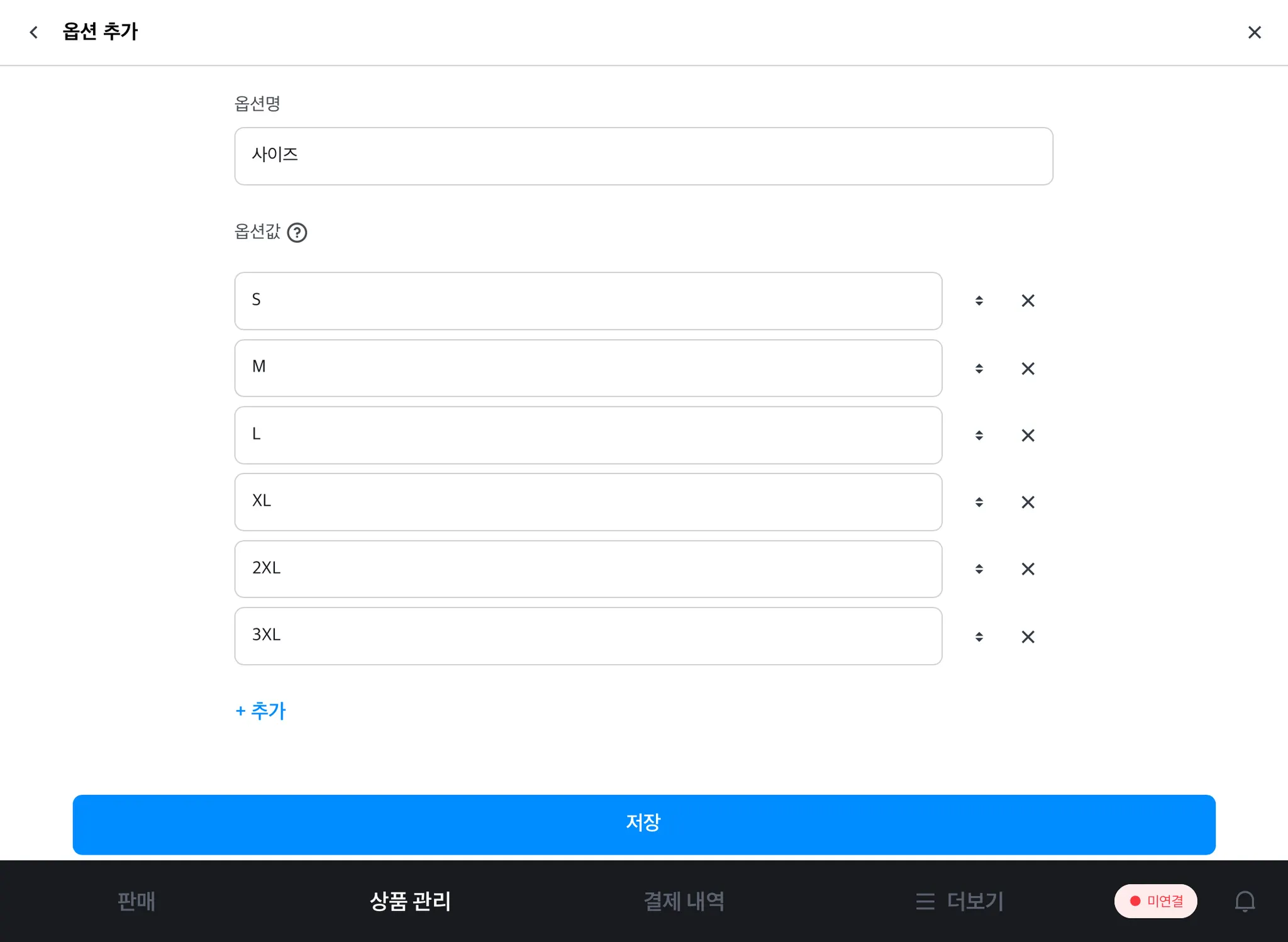 [추가]를 눌러 새로운 옵션값을 추가할 수 있으며 [저장]을 누르면 반영됩니다.