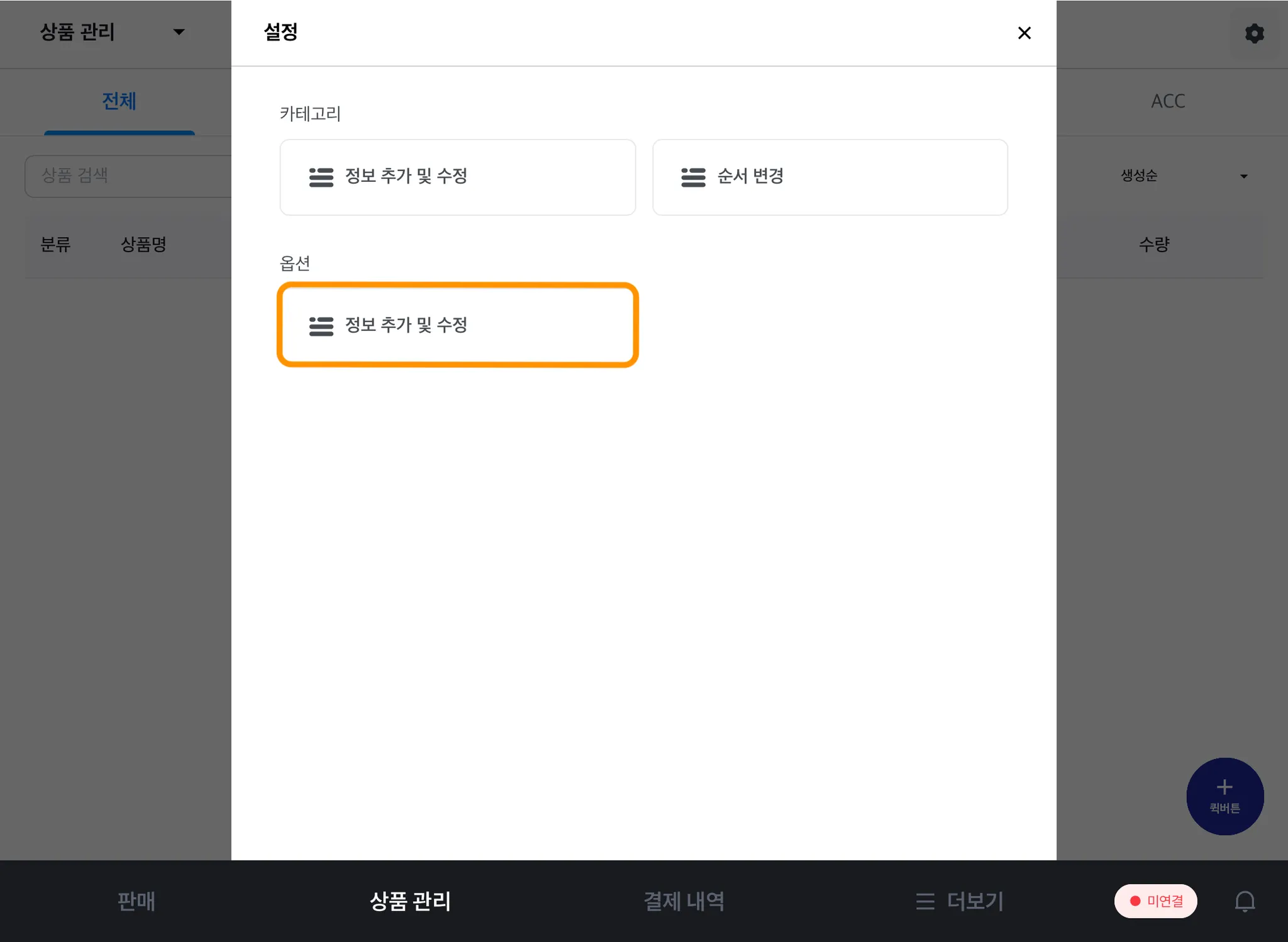 설정에서 옵션을 최초 1회 등록하고 옵션 불러와 쉽고 빠르게 매장을 운영해 보세요.