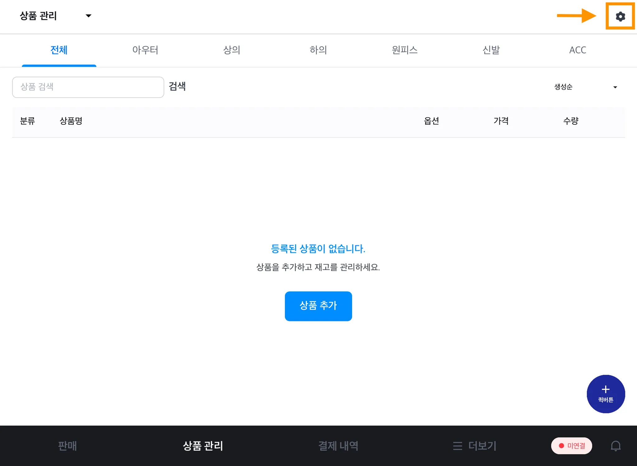 1) [상품 관리] 탭 → 우측 상단 [설정] 버튼을 눌러주세요.