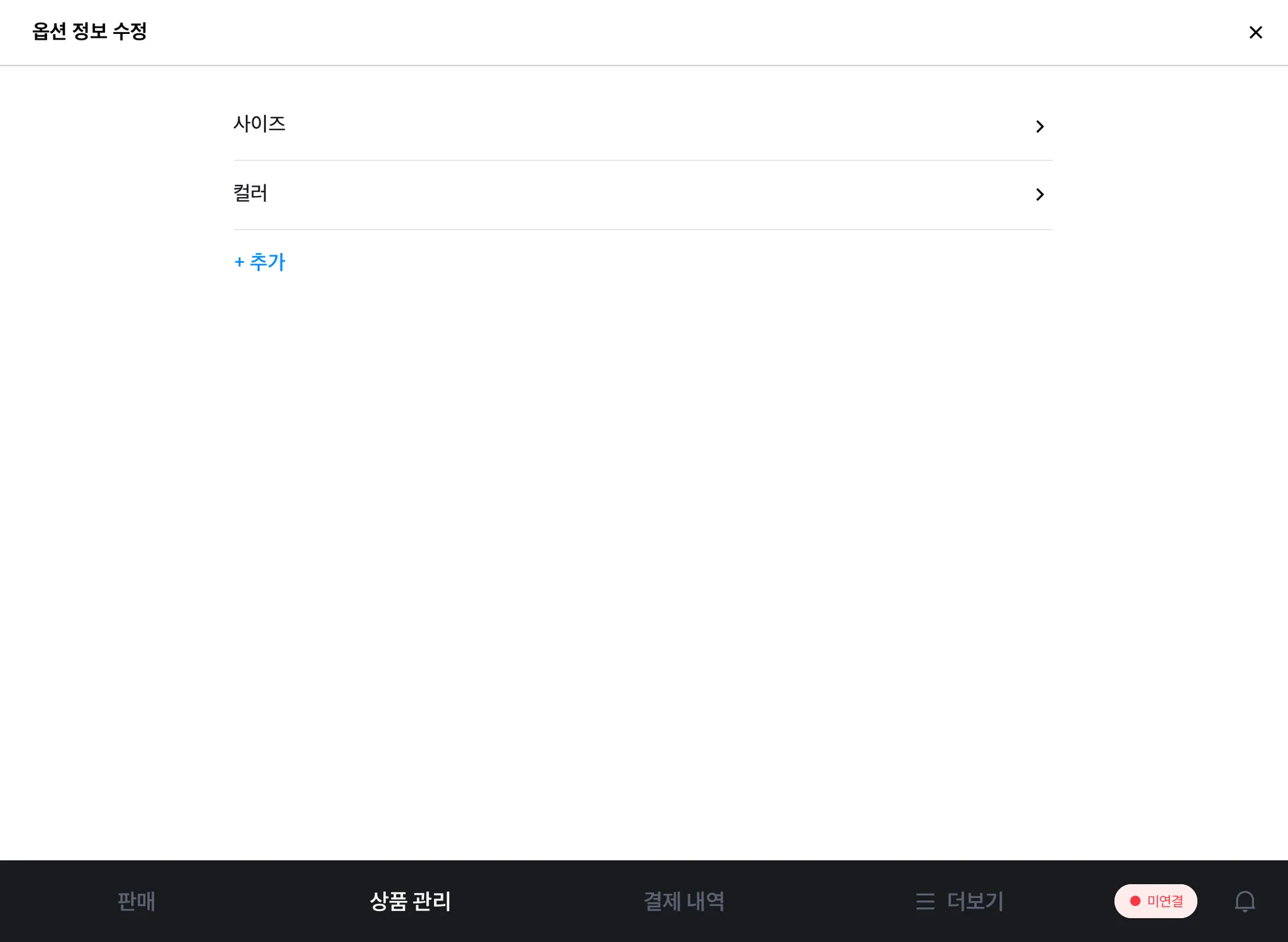 ex. 기존 [사이즈 옵션 S, M, L]에 XL추가 → 사이즈 옵션이 적용된 모든 상품에 XL옵션 자동 적용되지 않음