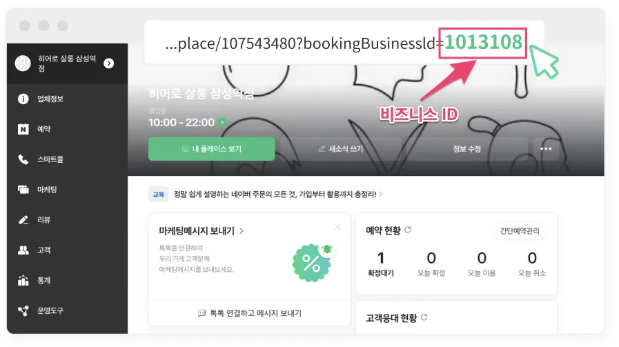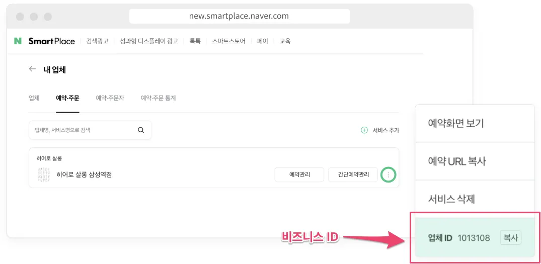 비즈니스ID는 네이버 스마트 플레이스에 접속 후 네이버 예약 서비스에서 확인할 수 있습니다.