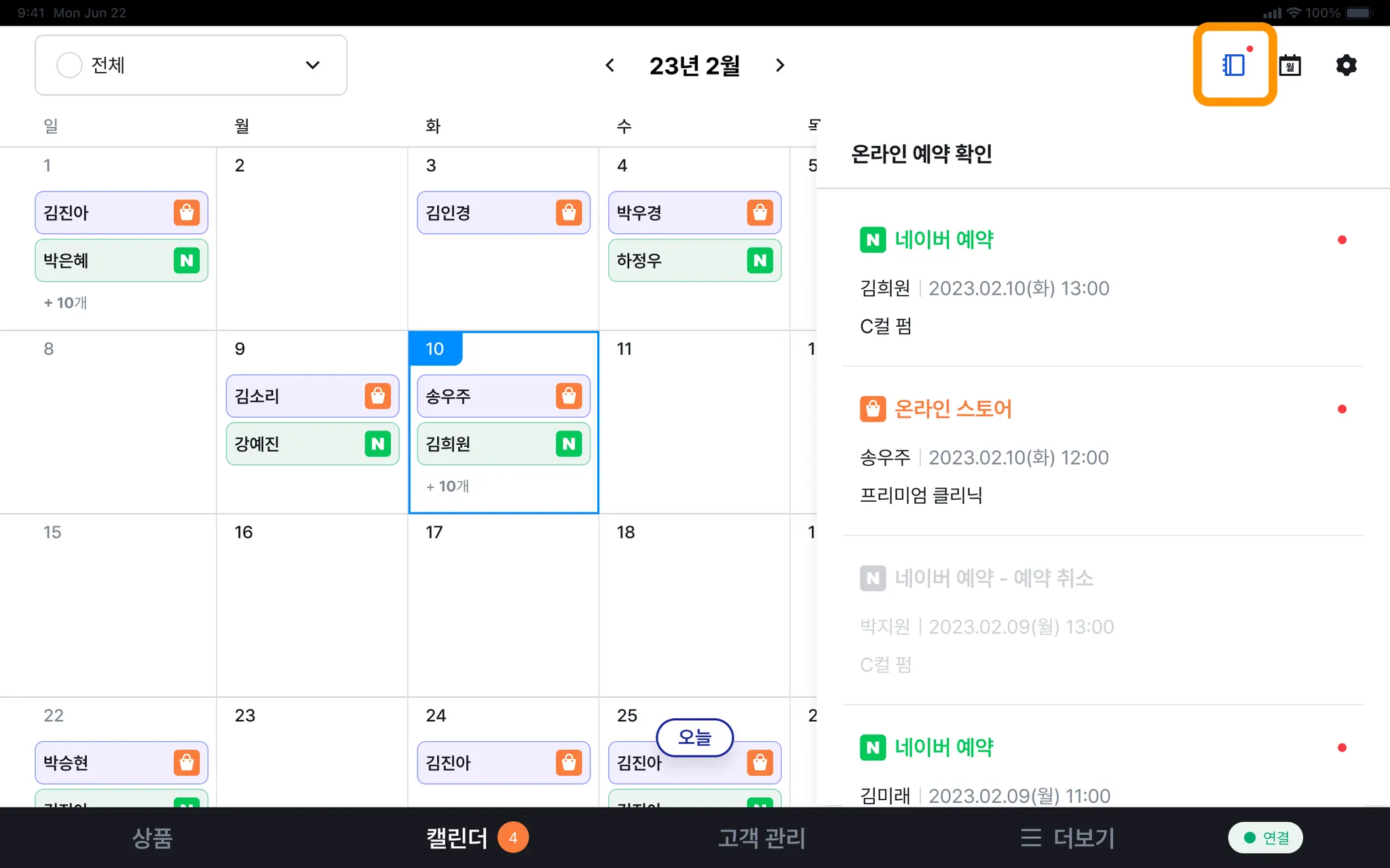 페이히어 셀러 홈 화면 하단 [캘린더] 탭에 해당 네이버 예약 건이 생성됩니다.
