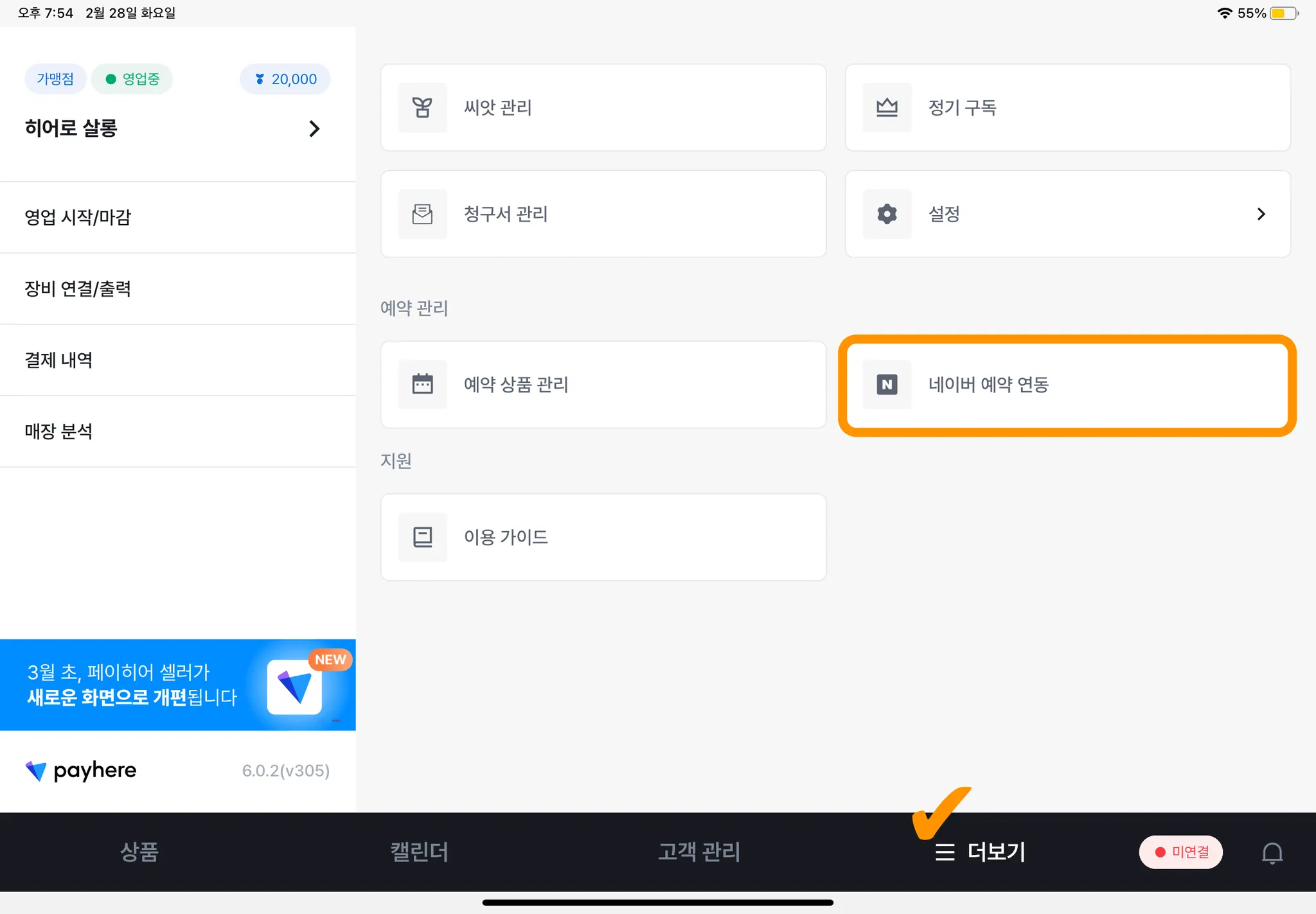 [☰ 더보기] → [네이버 예약 연동]을 눌러주세요.
