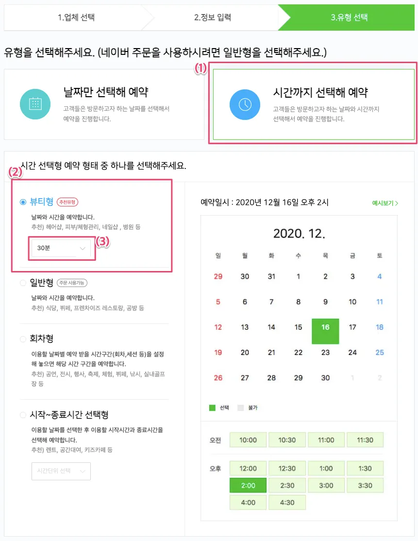 (1) 예약 유형 [시간까지 선택해 예약]으로 설정해야 합니다.