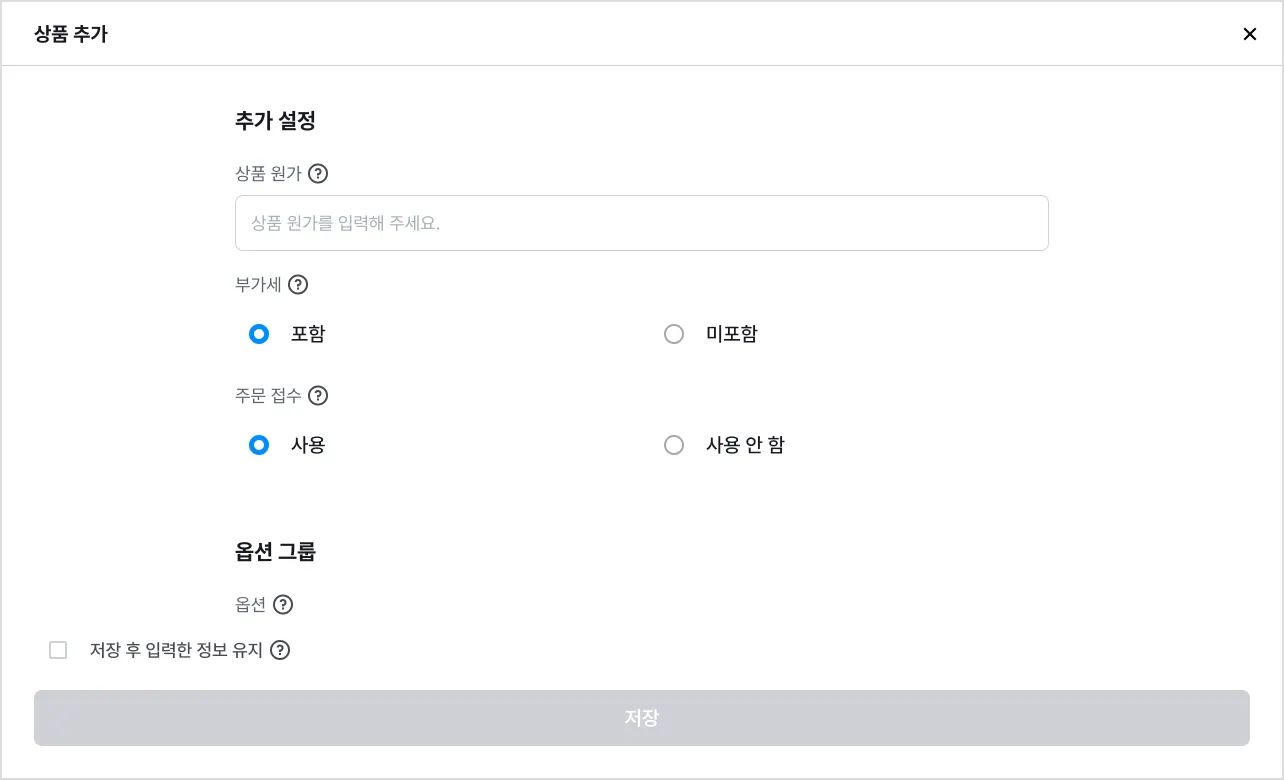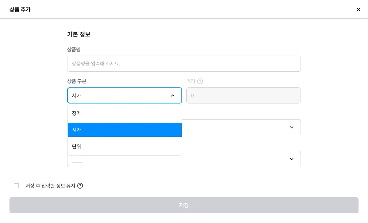 가격 : 상품을 주문 목록에 담을 때마다 입력하기 때문에 기본 정보 입력을 지원하지 않음