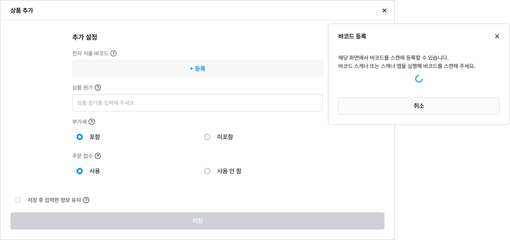 상품 바코드 : [+ 등록]을 눌러 상품 바코드 정보 저장 가능
