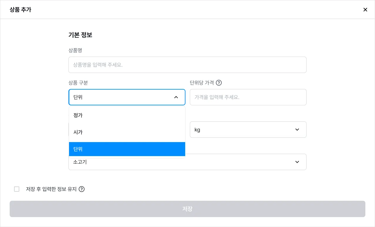 상품 구분 : 일반 상품은 ‘단위’로 선택