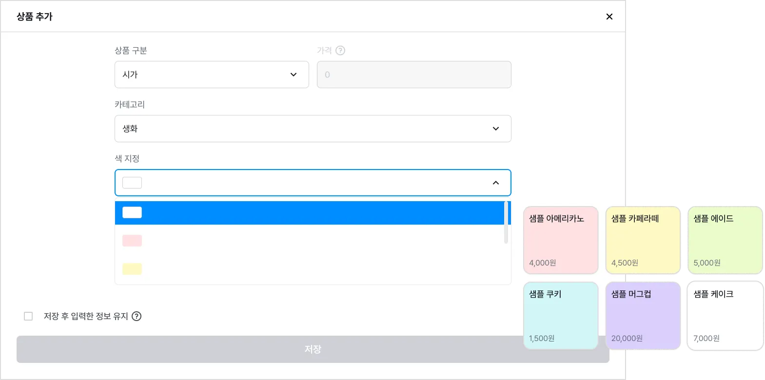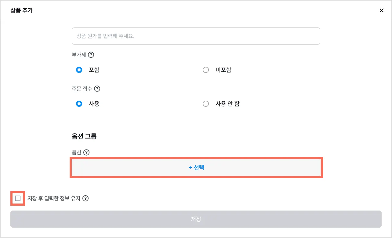 저장 후 입력한 정보 유지를 체크한 상태로 [저장]하면, 상품 하나가 생성되며 입력한 정보가 그대로 남아 있는 상태에서 이어 다른 상품을 추가할 수 있어요. (바코드 제외)