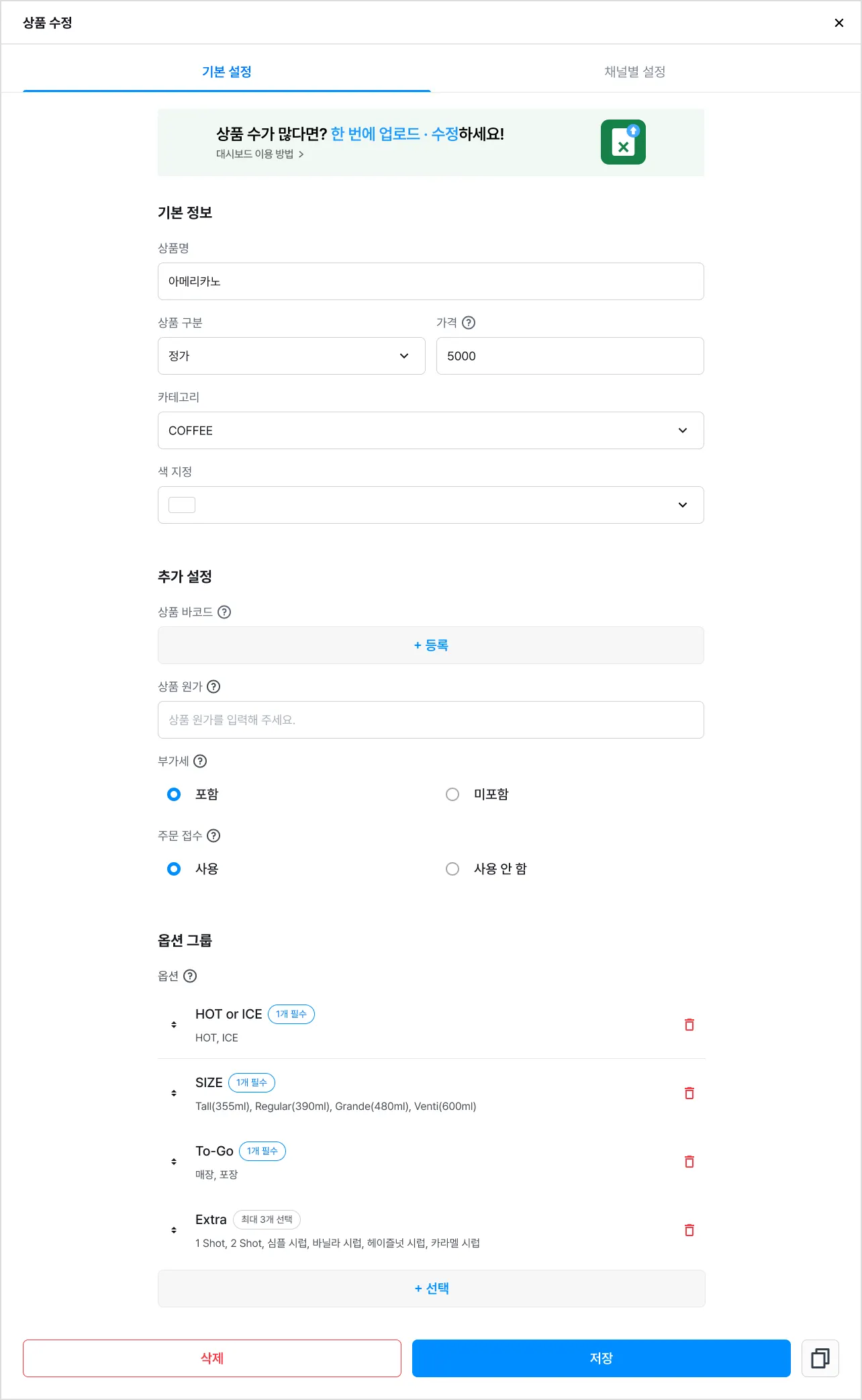 2) 상품 수정에서 입력된 정보를 변경한 다음 [저장]하거나 [삭제]할 수 있어요.