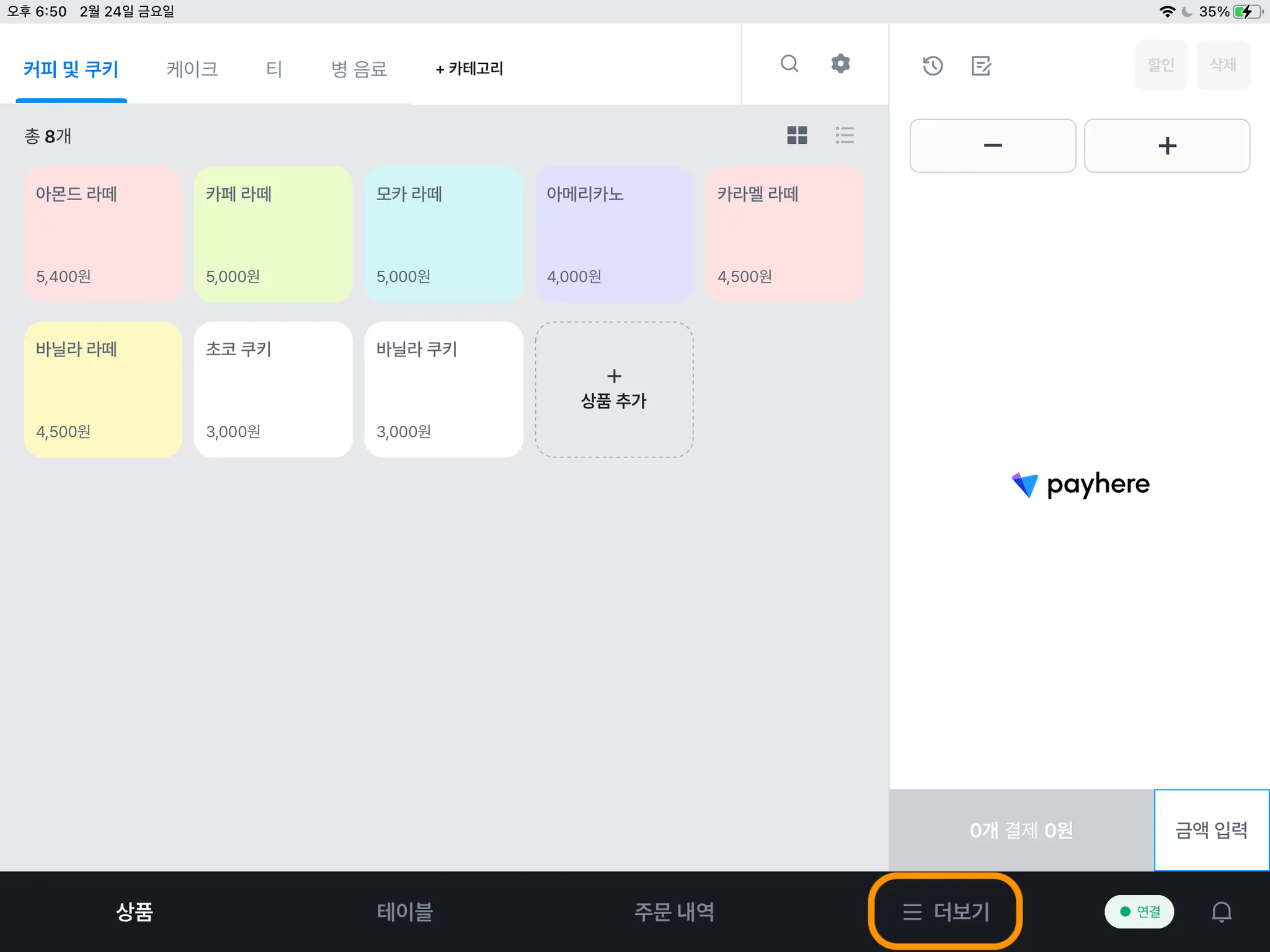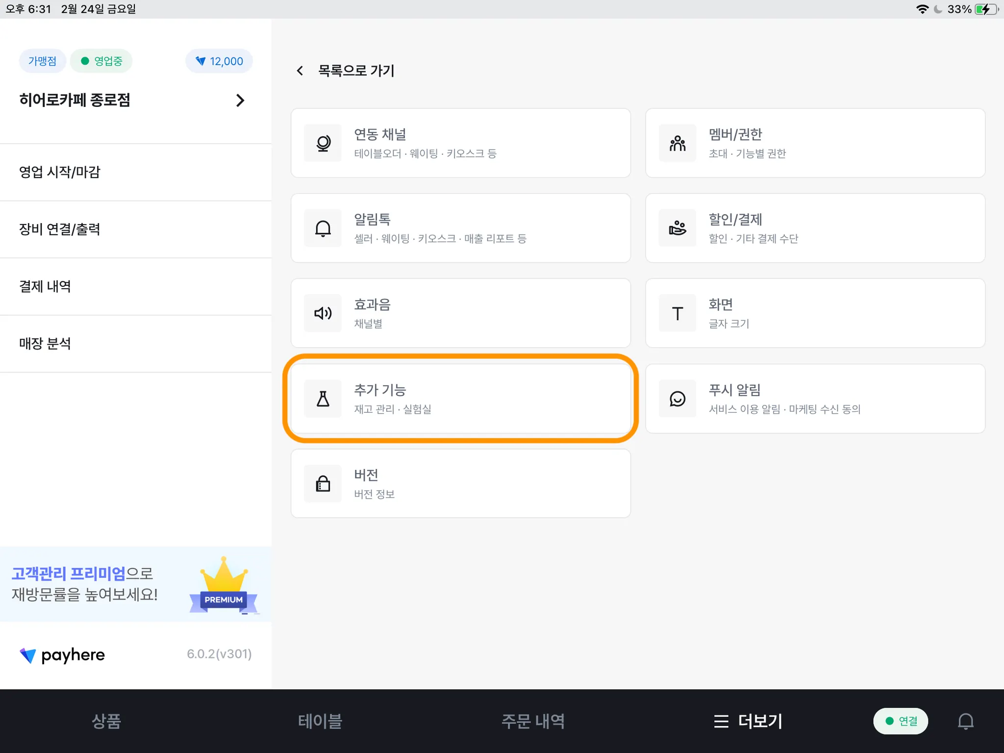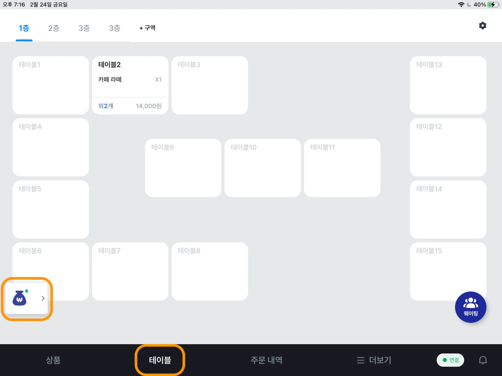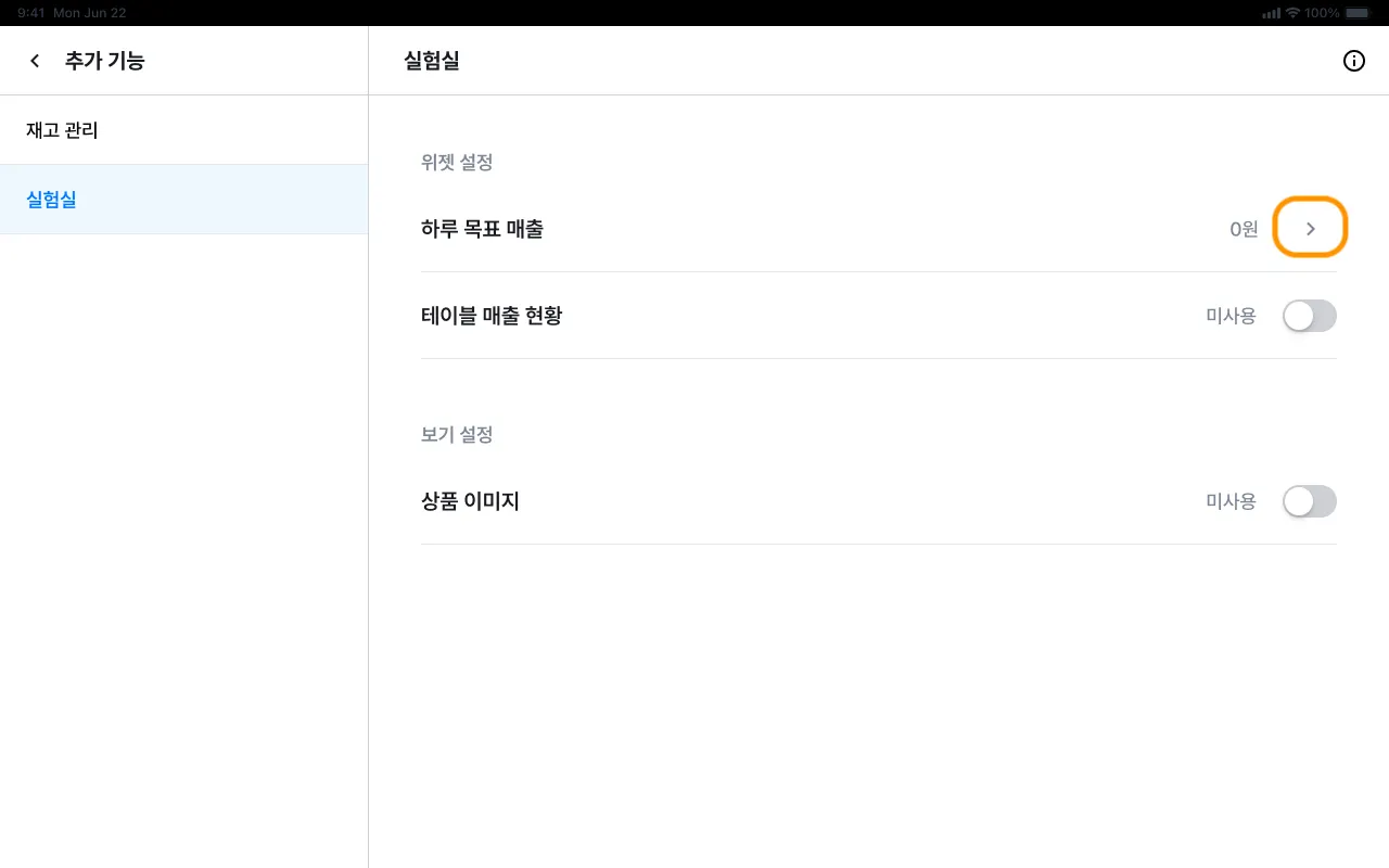 1) [실험실] → [테이블 매출 현황] 버튼을 활성화해 주세요.