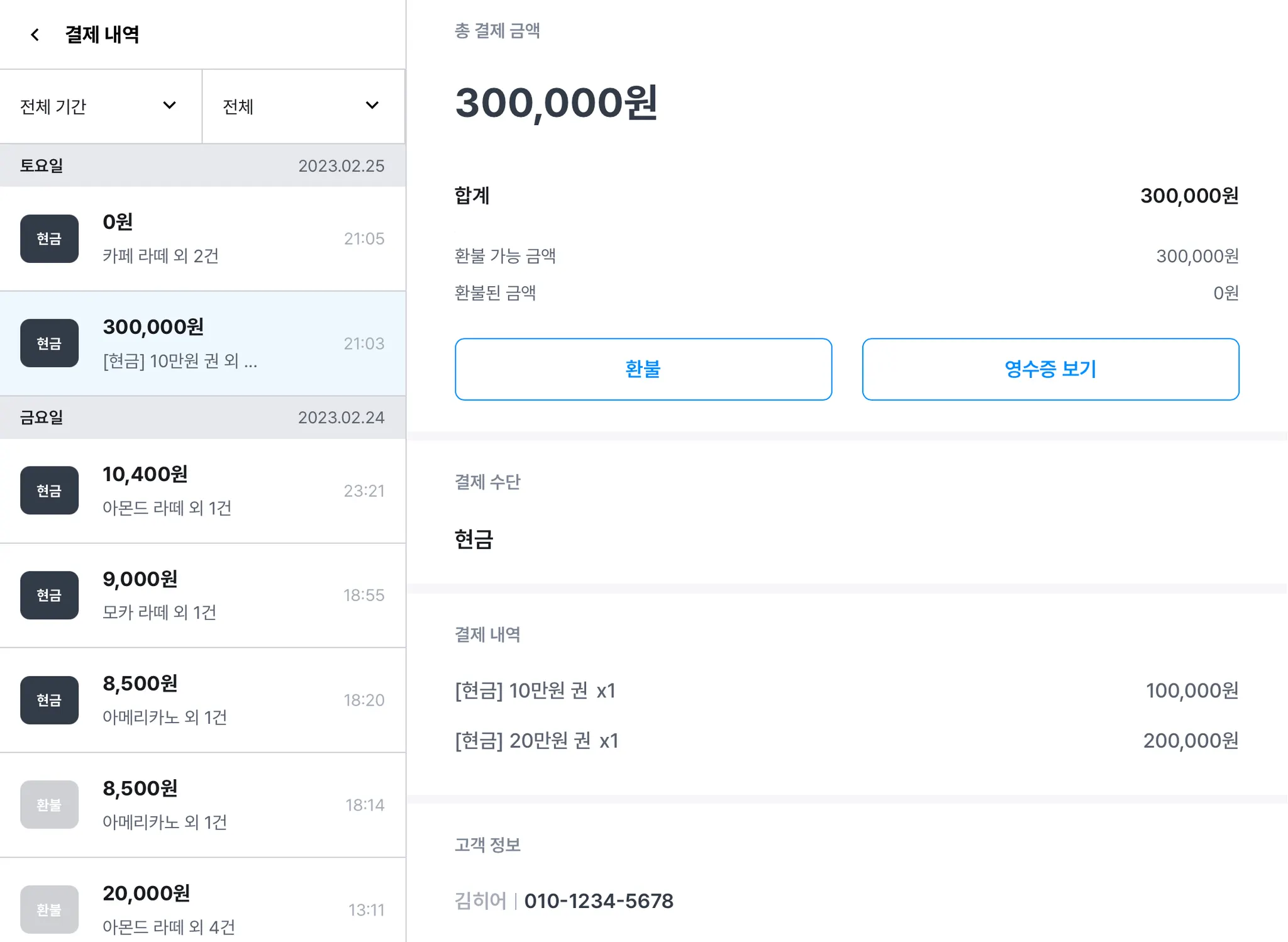선불권 사용 시에도 [결제 내역]에서 선불권 사용 금액과 고객 정보를 확인할 수 있습니다.