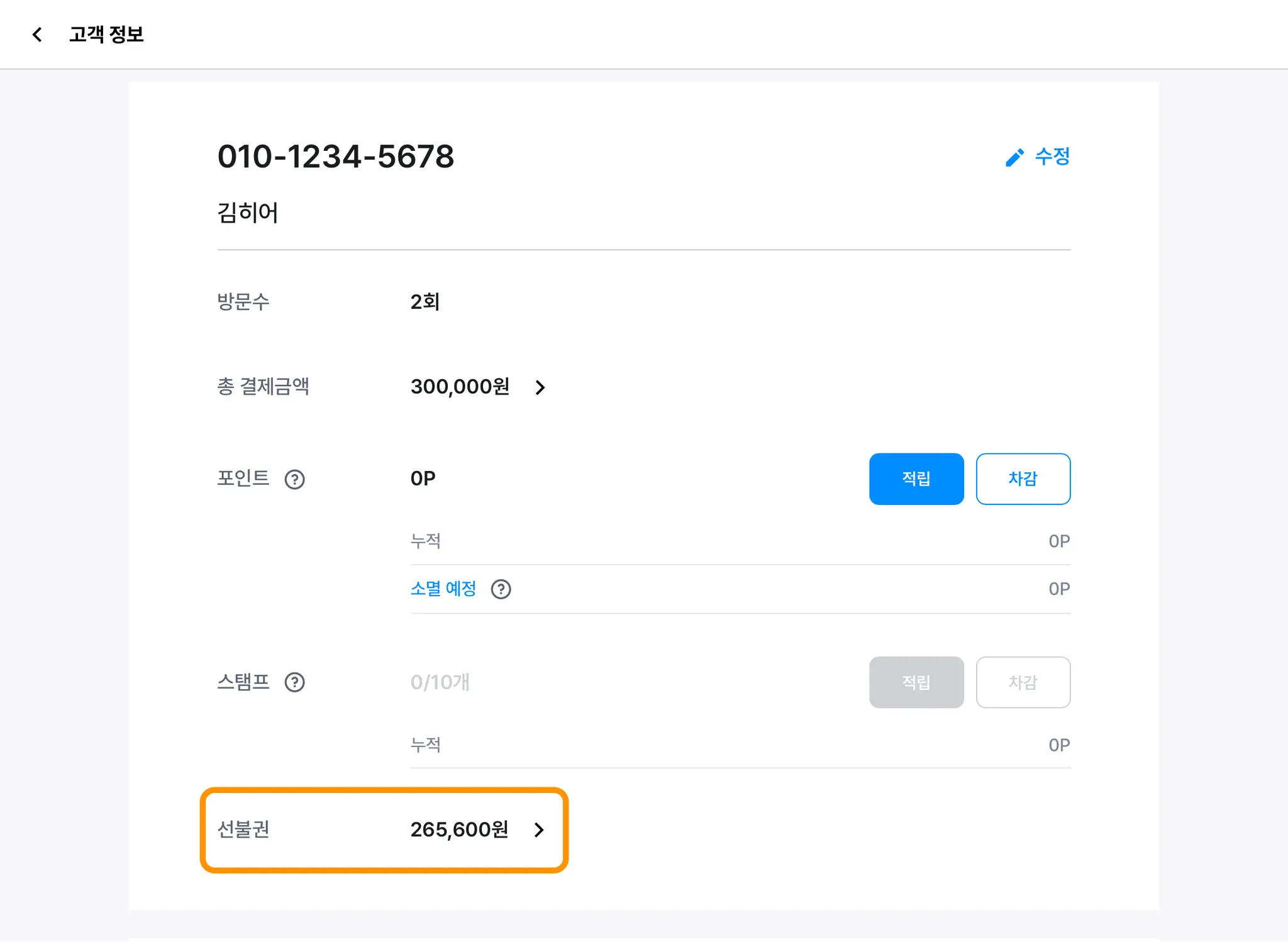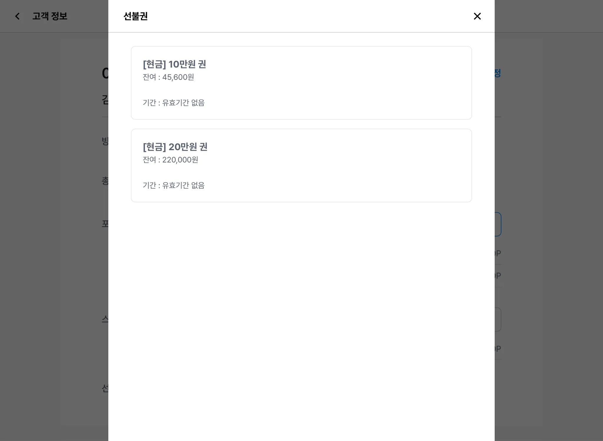 2) 고객을 조회했을 때, 보유한 선불권(회원권)을 확인할 수 있습니다.