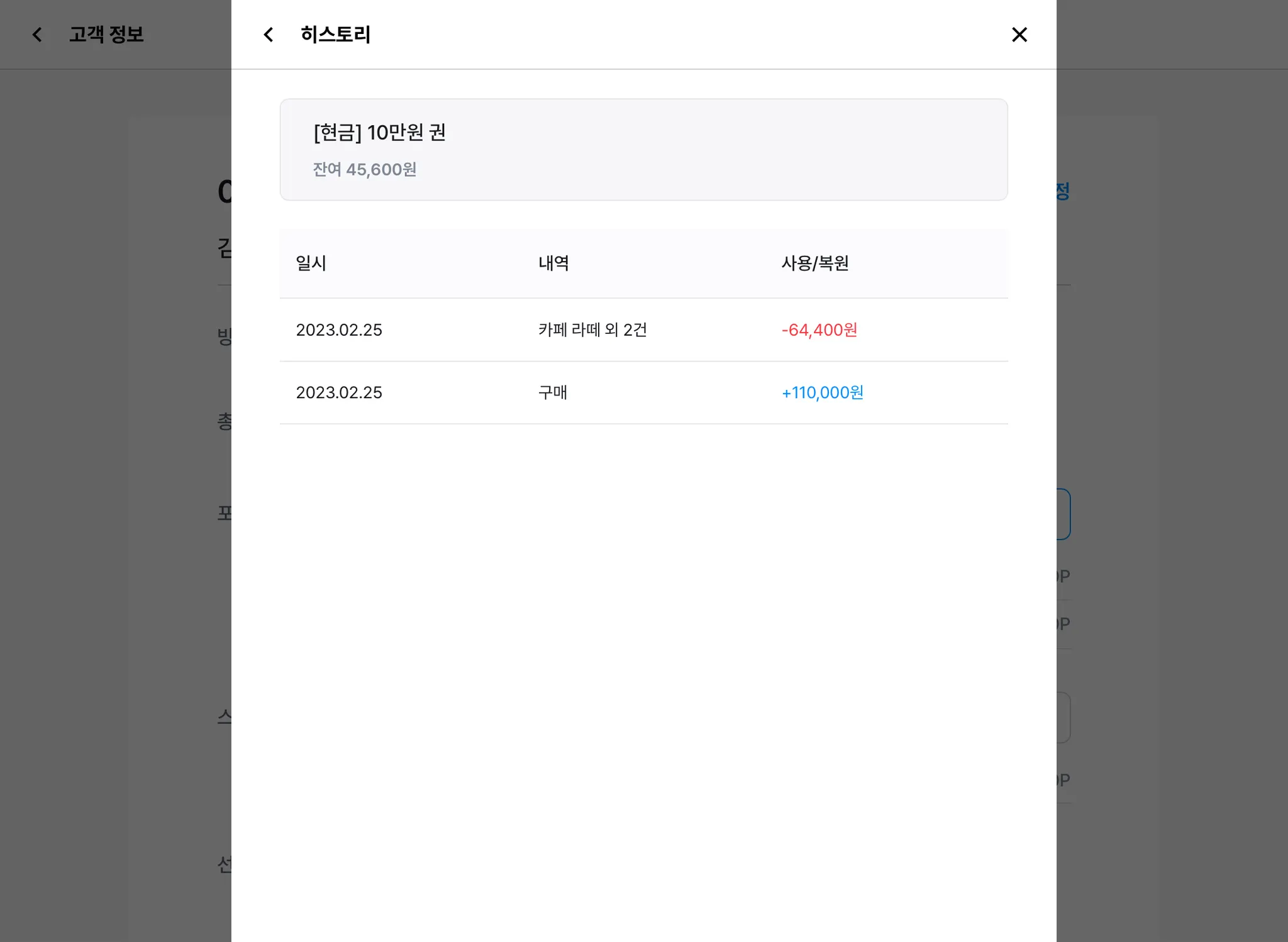 해당 고객의 선불권의 잔여 금액, 구매 및 사용 내역을 확인할 수 있습니다.