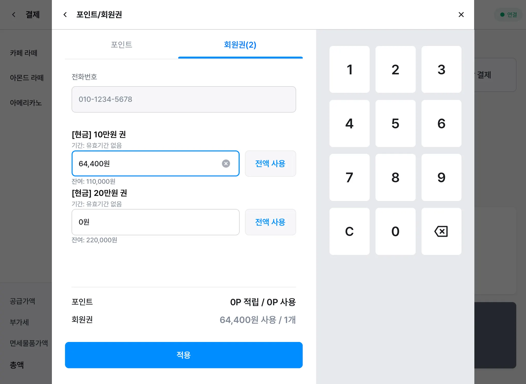 회원권을 먼저 사용하고 할인을 적용하게 되면 적용 내용이 사라집니다(합계 금액 변경 문제).
