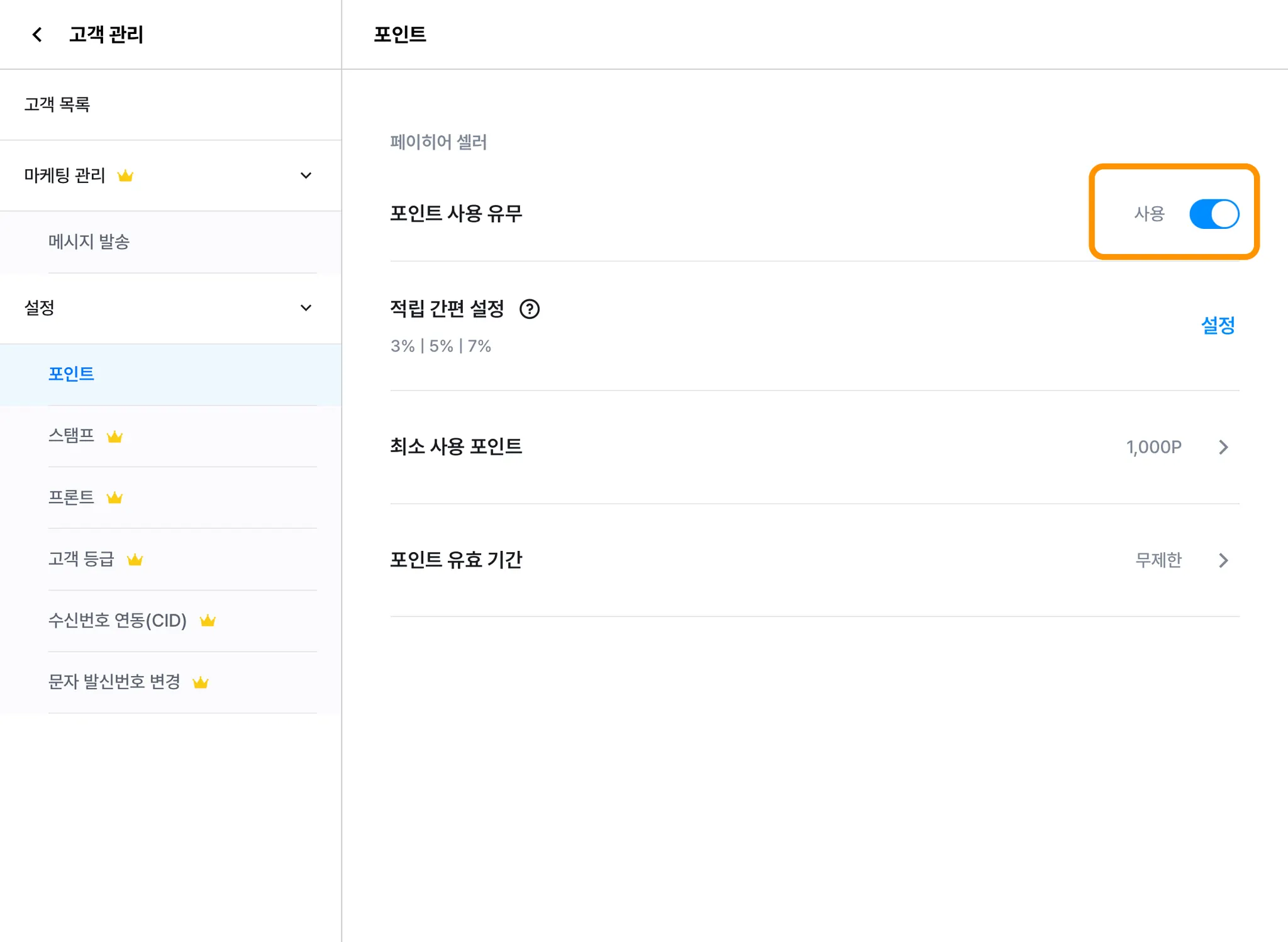 페이히어 셀러 [≡ 더보기] → [고객 관리] → [설정] → [포인트] → 포인트 사용 유무 ‘사용’