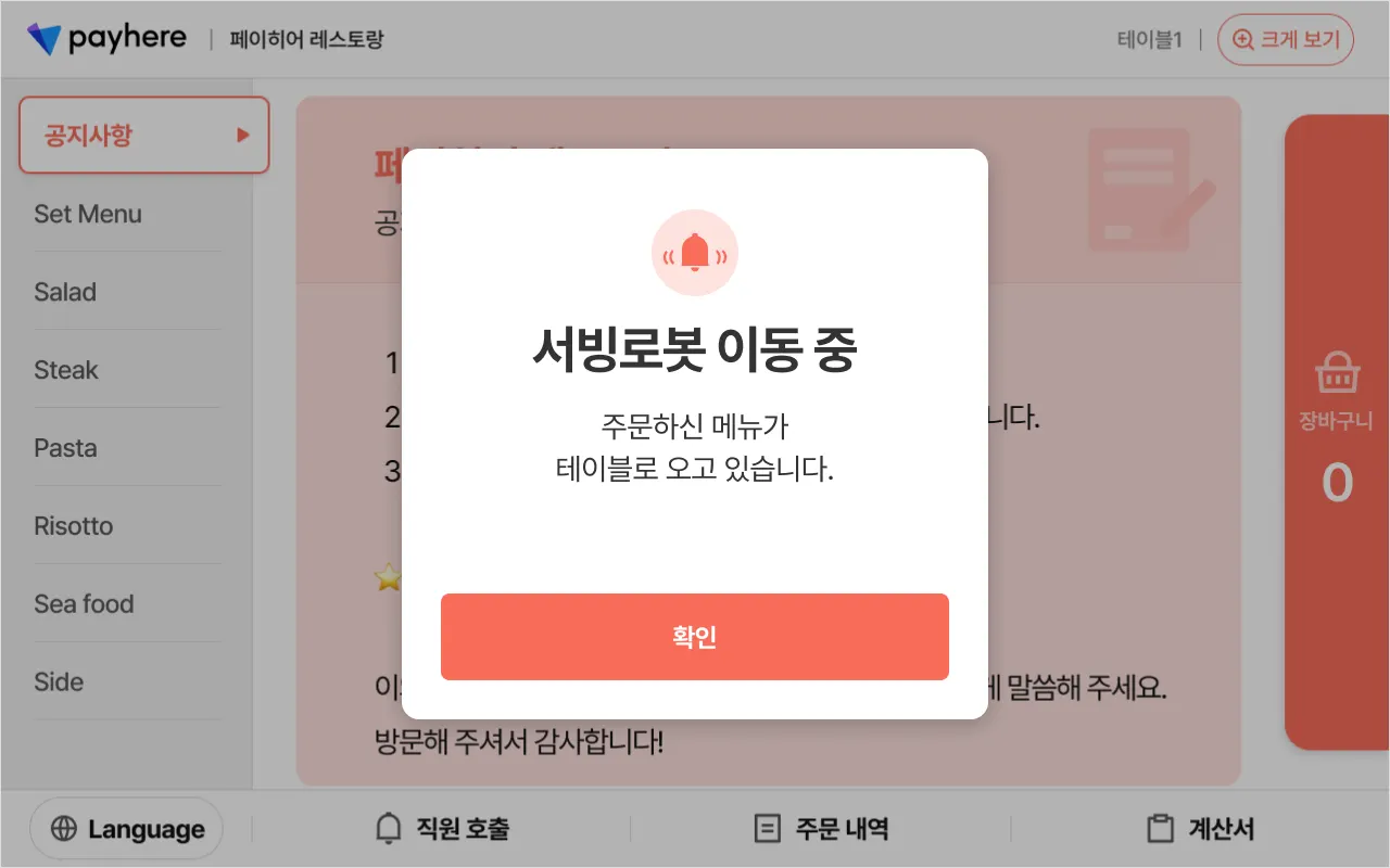 서빙 로봇이 도착하면 창은 자동으로 꺼지며, [확인]을 눌러 끌 수도 있어요.